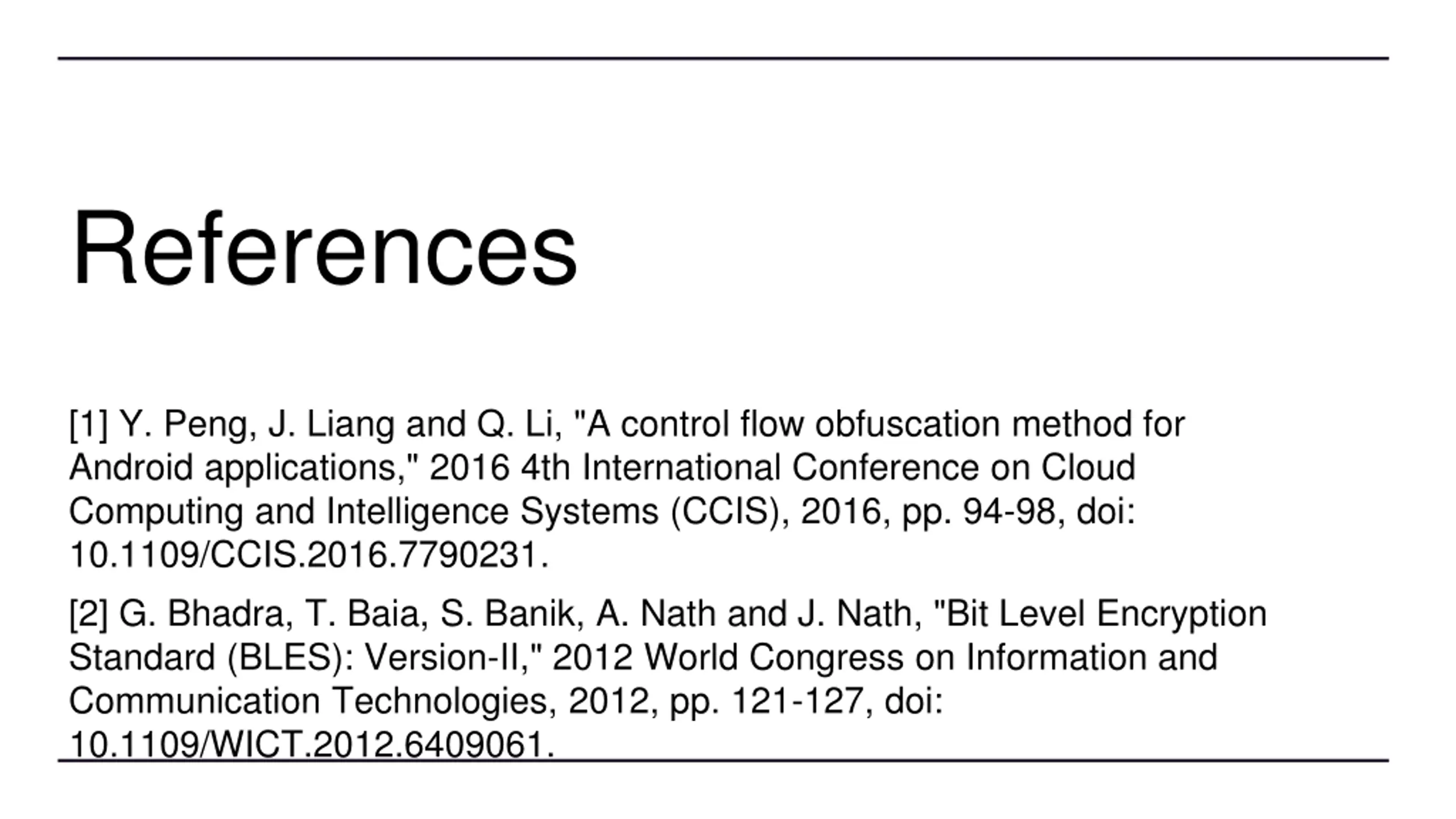 References [1] Y. Peng, J. Liang and Q. Li, "A control flow obfuscation method for Android applications," 2016 4th International Conference on Cloud Computing and Intelligence Systems (CCIS), 2016, pp. 94-98, doi: 10.1109/CCIS.2016.7790231. [2] G. Bhadra, T. Baia, S. Banik, A. Nath and J. Nath, "Bit Level Encryption Standard (BLES): Version-II," 2012 World Congress on Information and Communication Technologies, 2012, pp. 121-127, doi: 10.1109/WICT.2012.6409061.