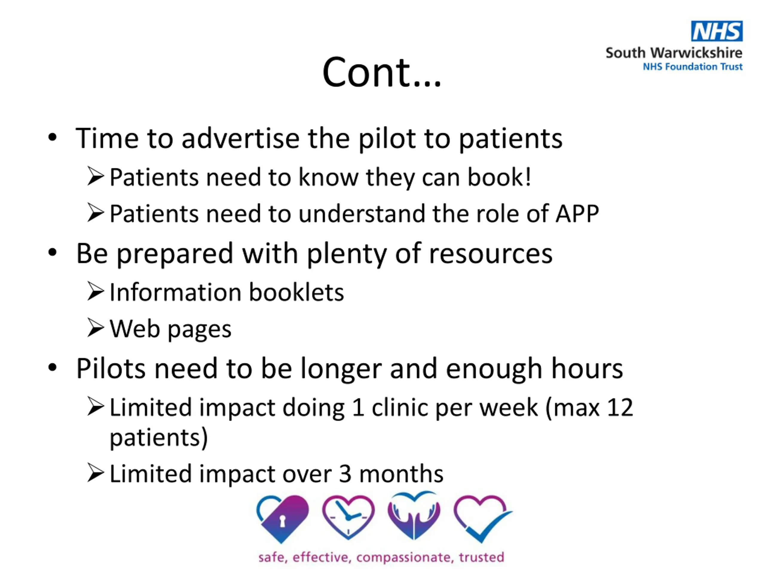 Cont Time to advertise the pilot to patients Patients need to know they can book! Patients need to understand the role of APP Be prepared with plenty of resources Information booklets Web pages Pilots need to be longer and enough hours Limited impact doing 1 clinic per week (max 12 patients) Limited impact over 3 months