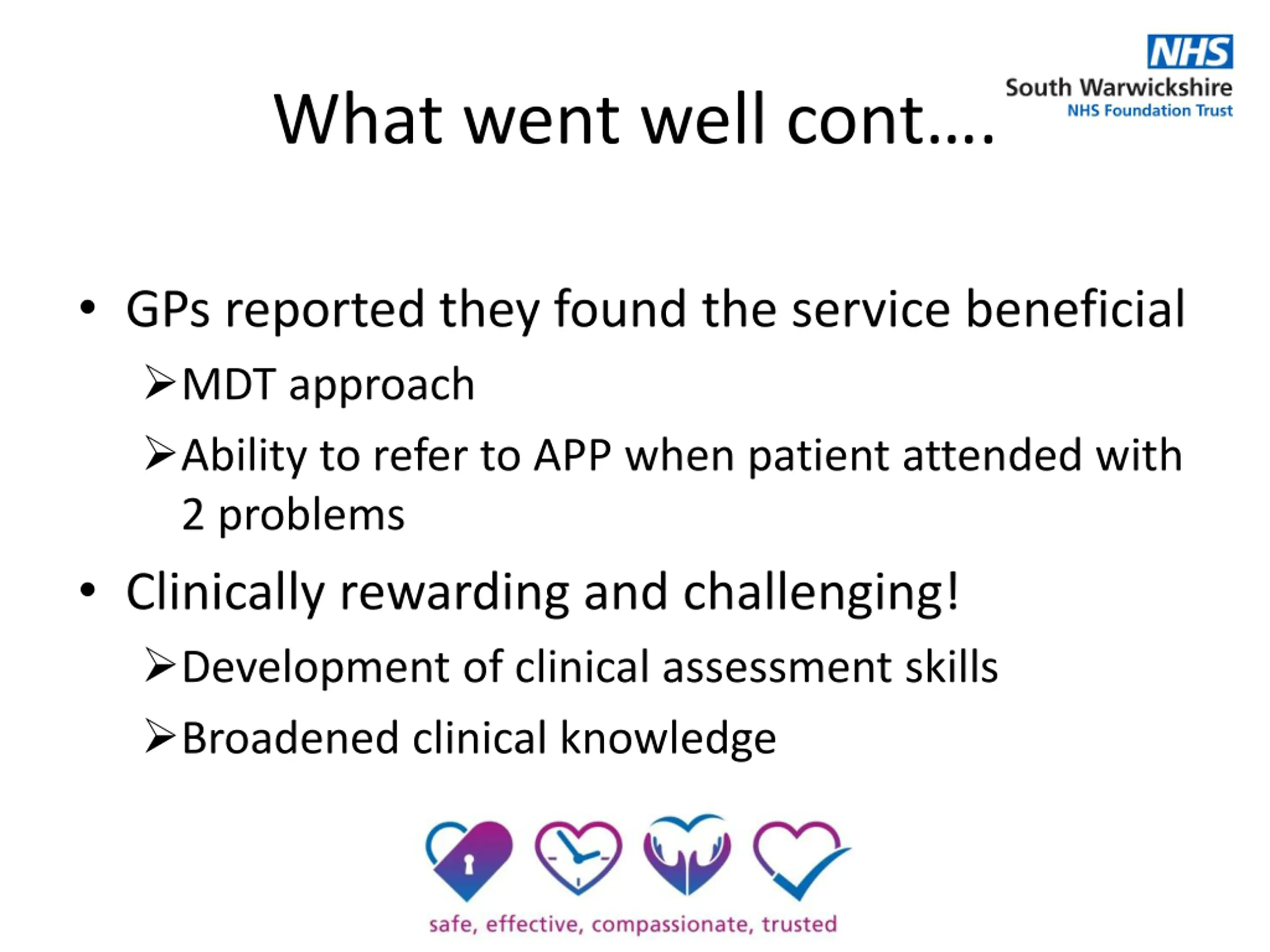 What went well cont. GPs reported they found the service beneficial MDT approach Ability to refer to APP when patient attended with 2 problems Clinically rewarding and challenging! Development of clinical assessment skills Broadened clinical knowledge