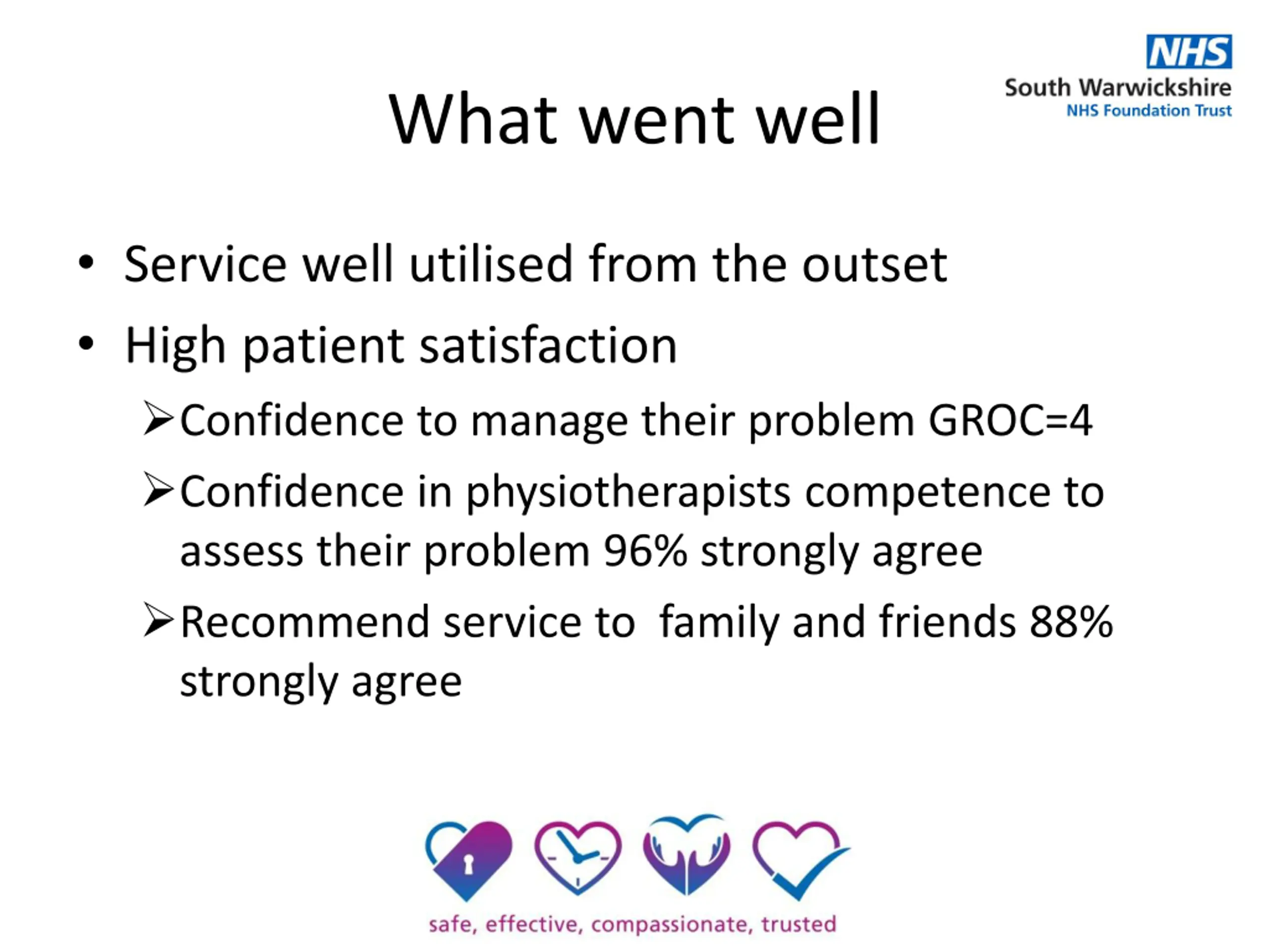 What went well Service well utilised from the outset High patient satisfaction Confidence to manage their problem GROC=4 Confidence in physiotherapists competence to assess their problem 96% strongly agree Recommend service to family and friends 88% strongly agree