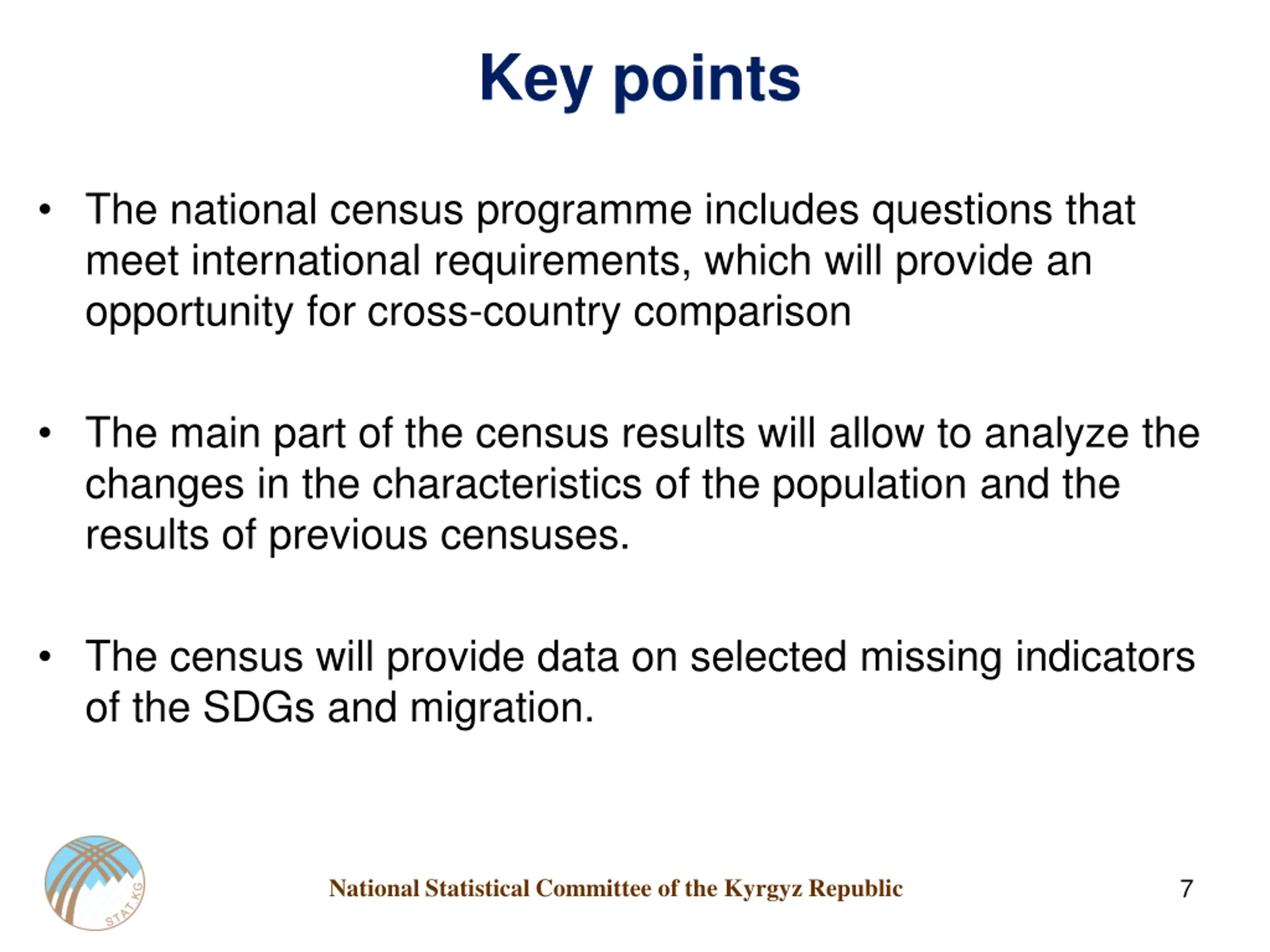 Key points The national census programme includes questions that meet international requirements, which will provide an opportunity for cross-country comparison The main part of the census results will allow to analyze the changes in the characteristics of the population and the results of previous censuses. The census will provide data on selected missing indicators of the SDGs and migration. National Statistical Committee of the Kyrgyz Republic 7