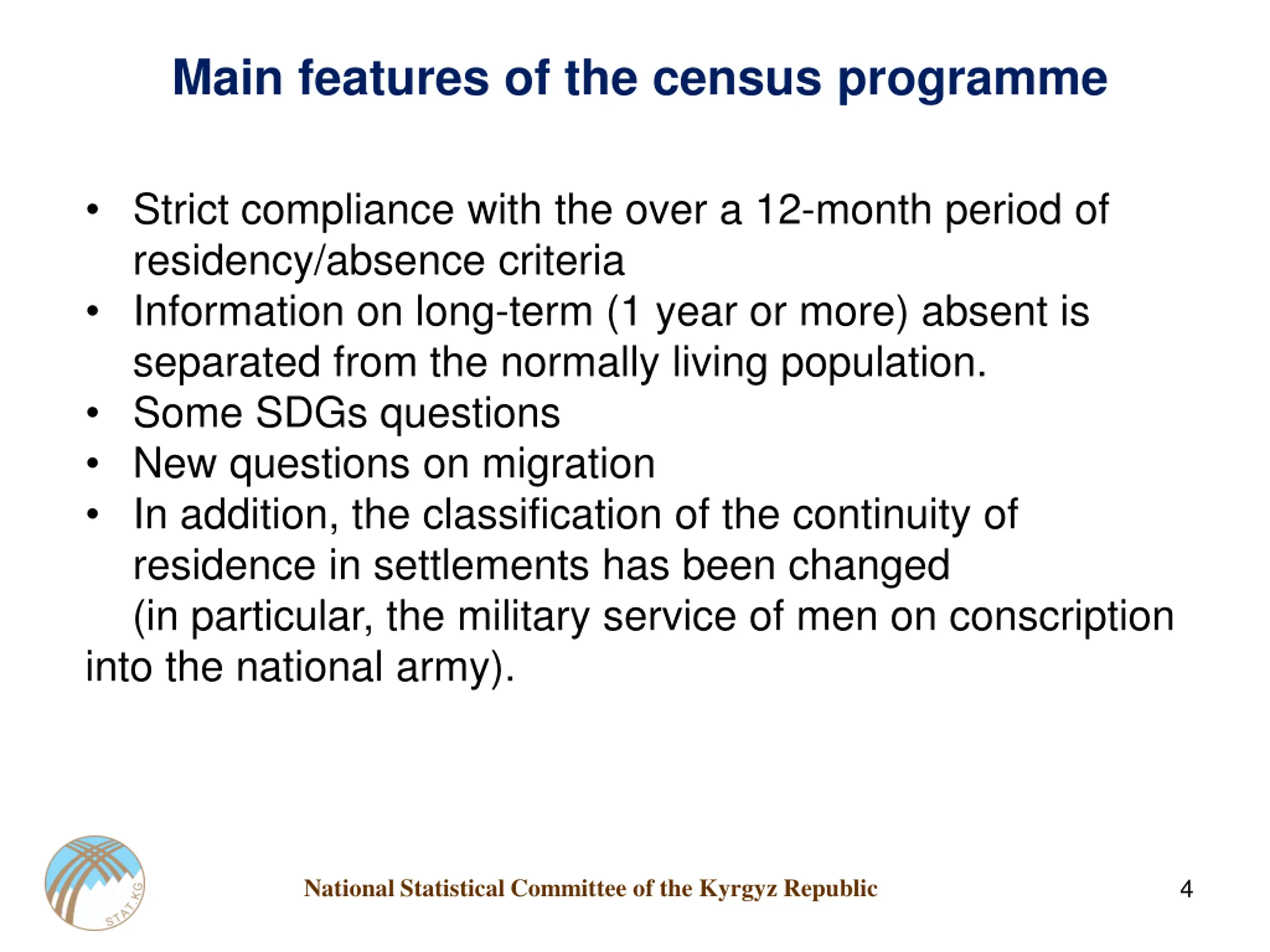 Main features of the census programme Strict compliance with the over a 12-month period of residency/absence criteria Information on long-term (1 year or more) absent is separated from the normally living population. Some SDGs questions New questions on migration In addition, the classification of the continuity of residence in settlements has been changed (in particular, the military service of men on conscription into the national army). National Statistical Committee of the Kyrgyz Republic 4