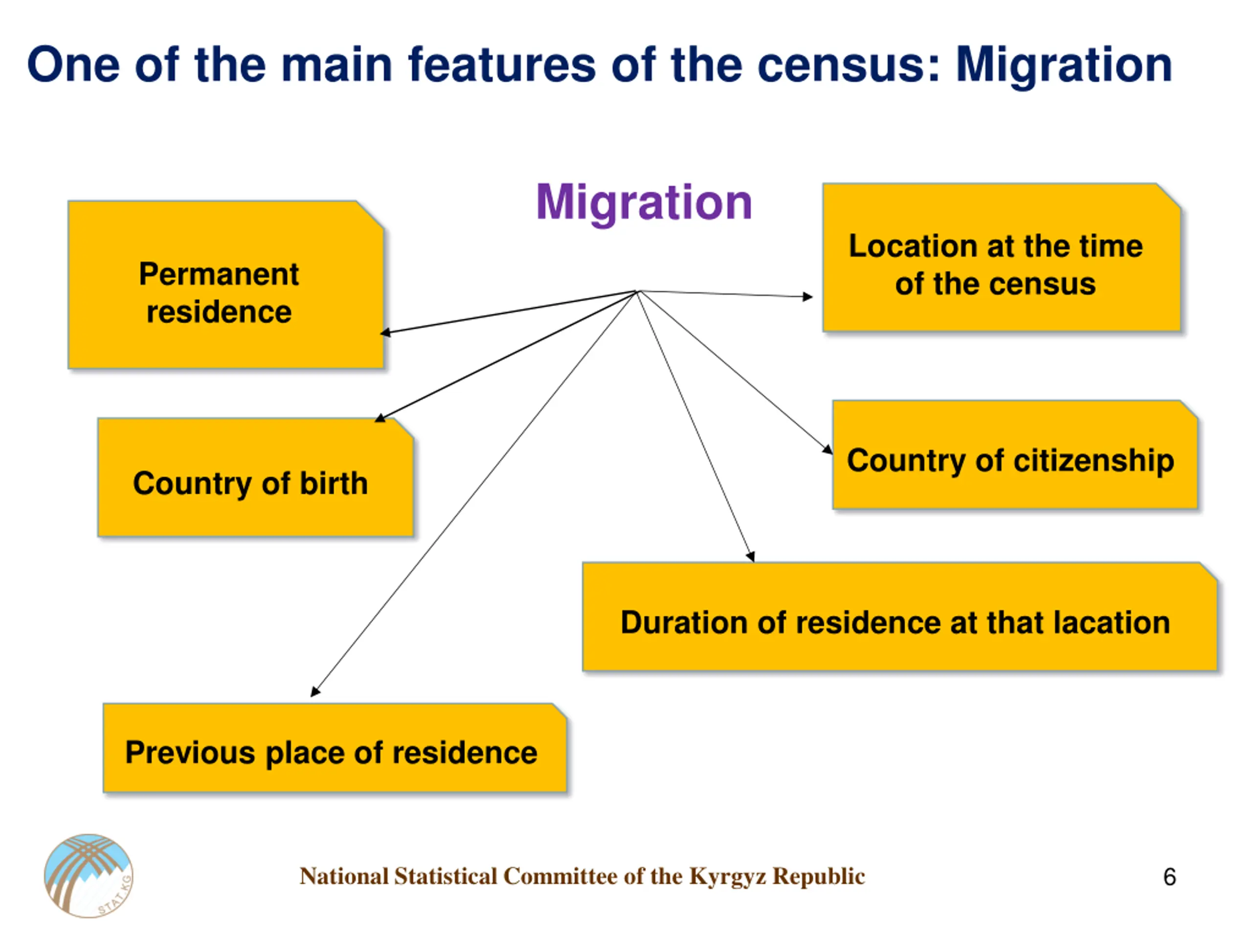 One of the main features of the census: Migration Migration Location at the time of the census Permanent residence Country of citizenship Country of birth Duration of residence at that lacation Previous place of residence National Statistical Committee of the Kyrgyz Republic 6