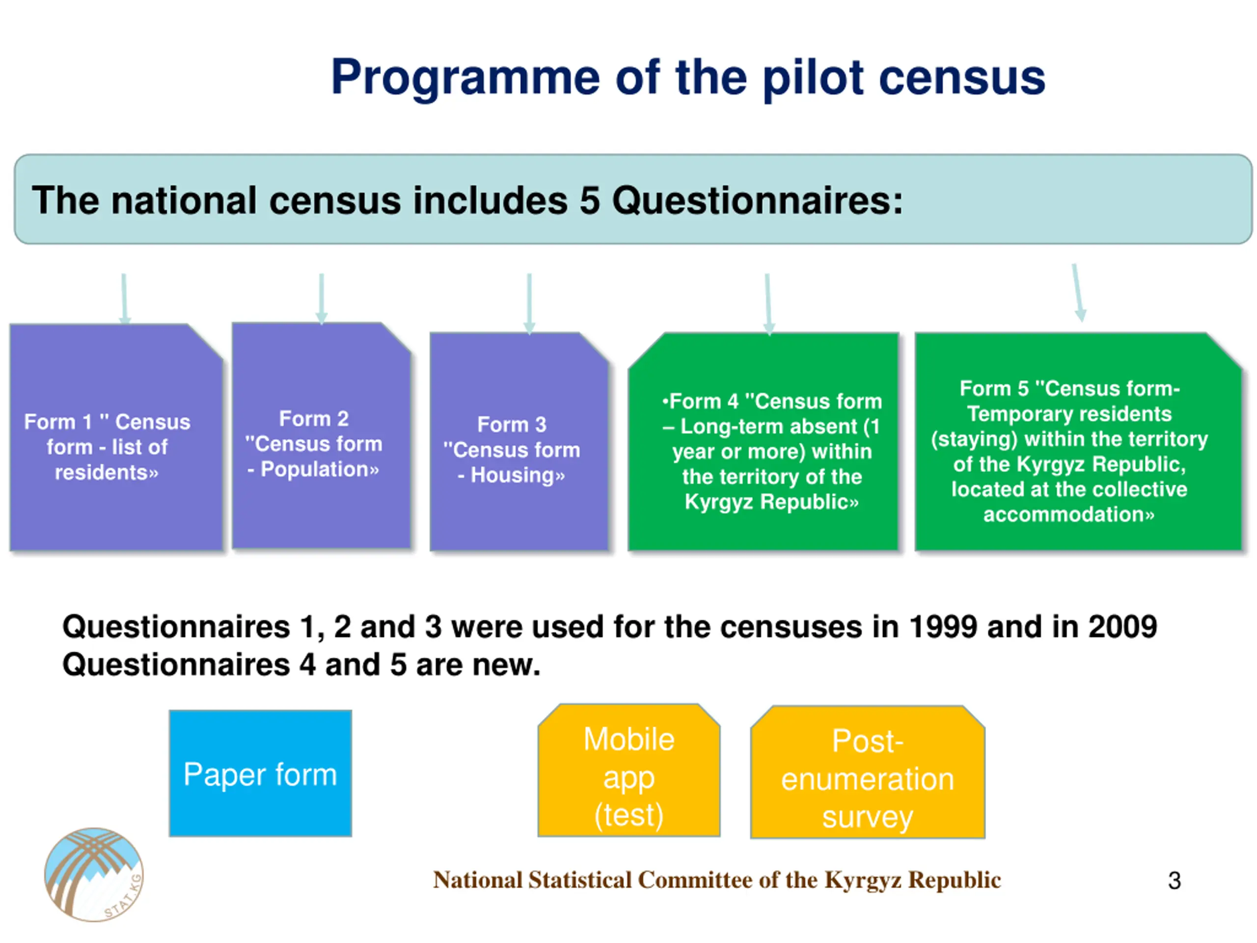 Programme of the pilot census The national census includes 5 Questionnaires: Form 5 "Census form- Temporary residents (staying) within the territory of the Kyrgyz Republic, located at the collective accommodation Form 4 "Census form Long-term absent (1 year or more) within the territory of the Kyrgyz Republic Form 2 "Census form - Population Form 1 " Census form - list of residents Form 3 "Census form - Housing Questionnaires 1, 2 and 3 were used for the censuses in 1999 and in 2009 Questionnaires 4 and 5 are new. Mobile app (test) Post- Paper form enumeration survey National Statistical Committee of the Kyrgyz Republic 3