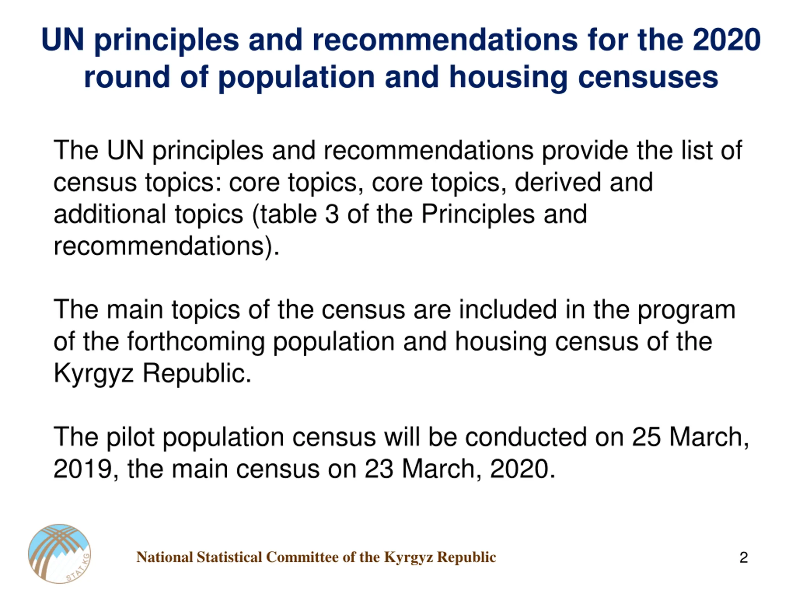 UN principles and recommendations for the 2020 round of population and housing censuses The UN principles and recommendations provide the list of census topics: core topics, core topics, derived and additional topics (table 3 of the Principles and recommendations). The main topics of the census are included in the program of the forthcoming population and housing census of the Kyrgyz Republic. The pilot population census will be conducted on 25 March, 2019, the main census on 23 March, 2020. National Statistical Committee of the Kyrgyz Republic 2