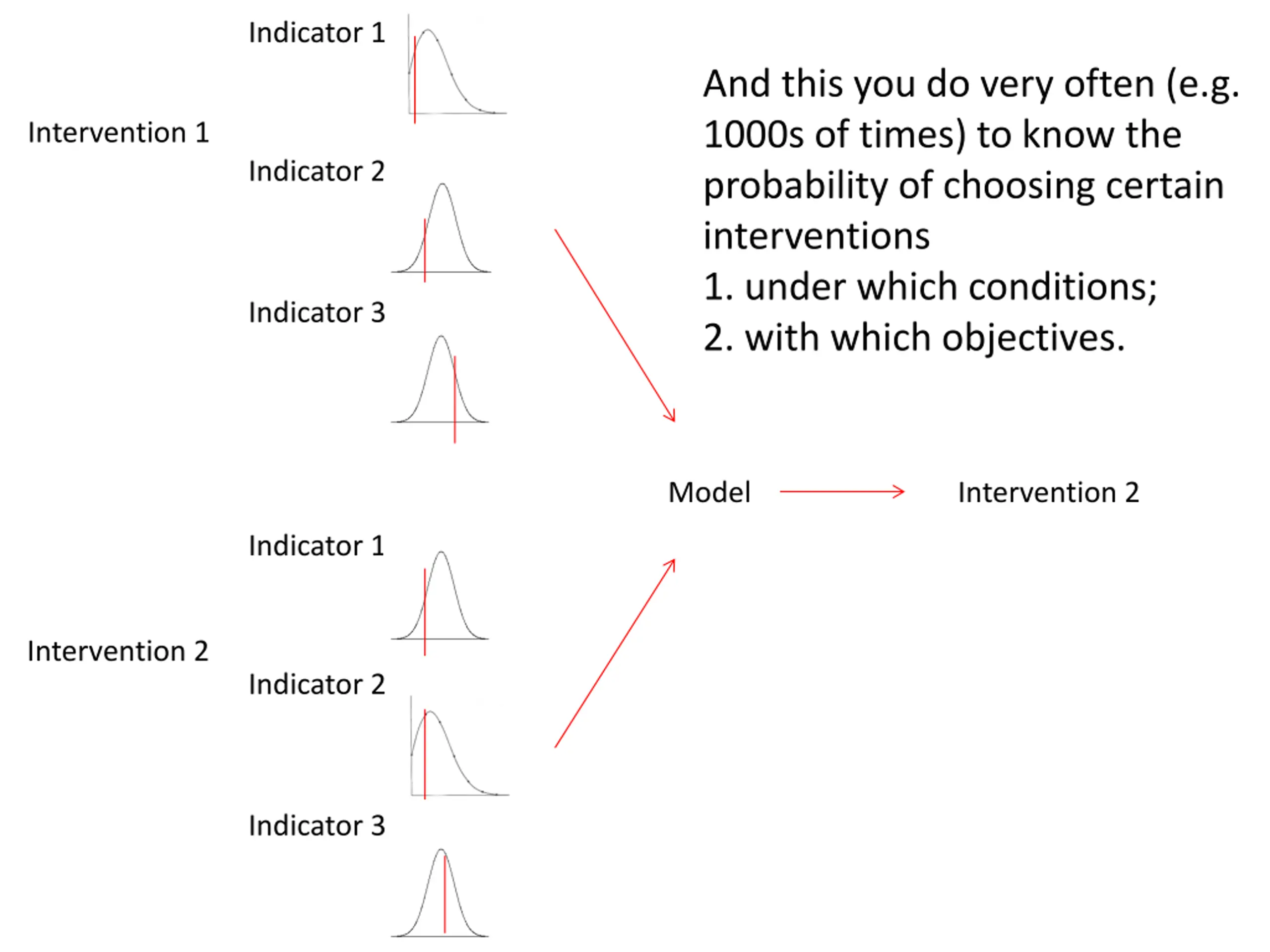 Indicator 1 And this you do very often (e.g. 1000s of times) to know the probability of choosing certain interventions 1. under which conditions; 2. with which objectives. Intervention 1 Indicator 2 Indicator 3 Model Intervention 2 Indicator 1 Intervention 2 Indicator 2 Indicator 3
