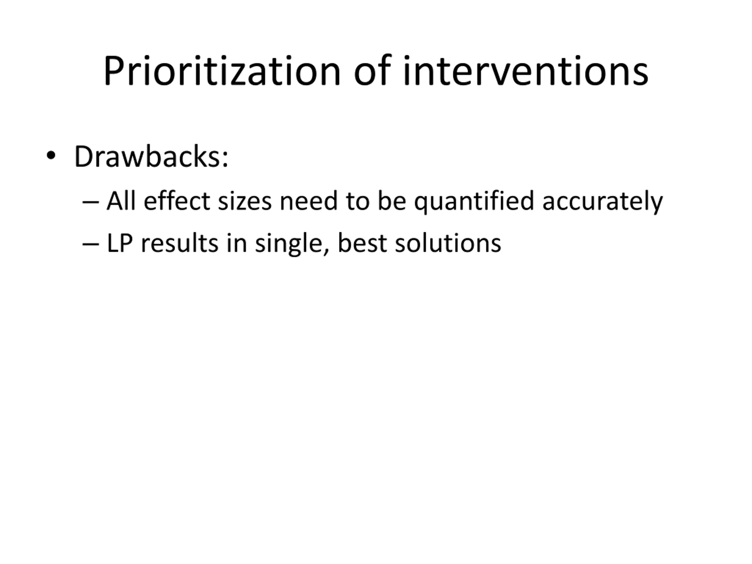 Prioritization of interventions Drawbacks: All effect sizes need to be quantified accurately LP results in single, best solutions