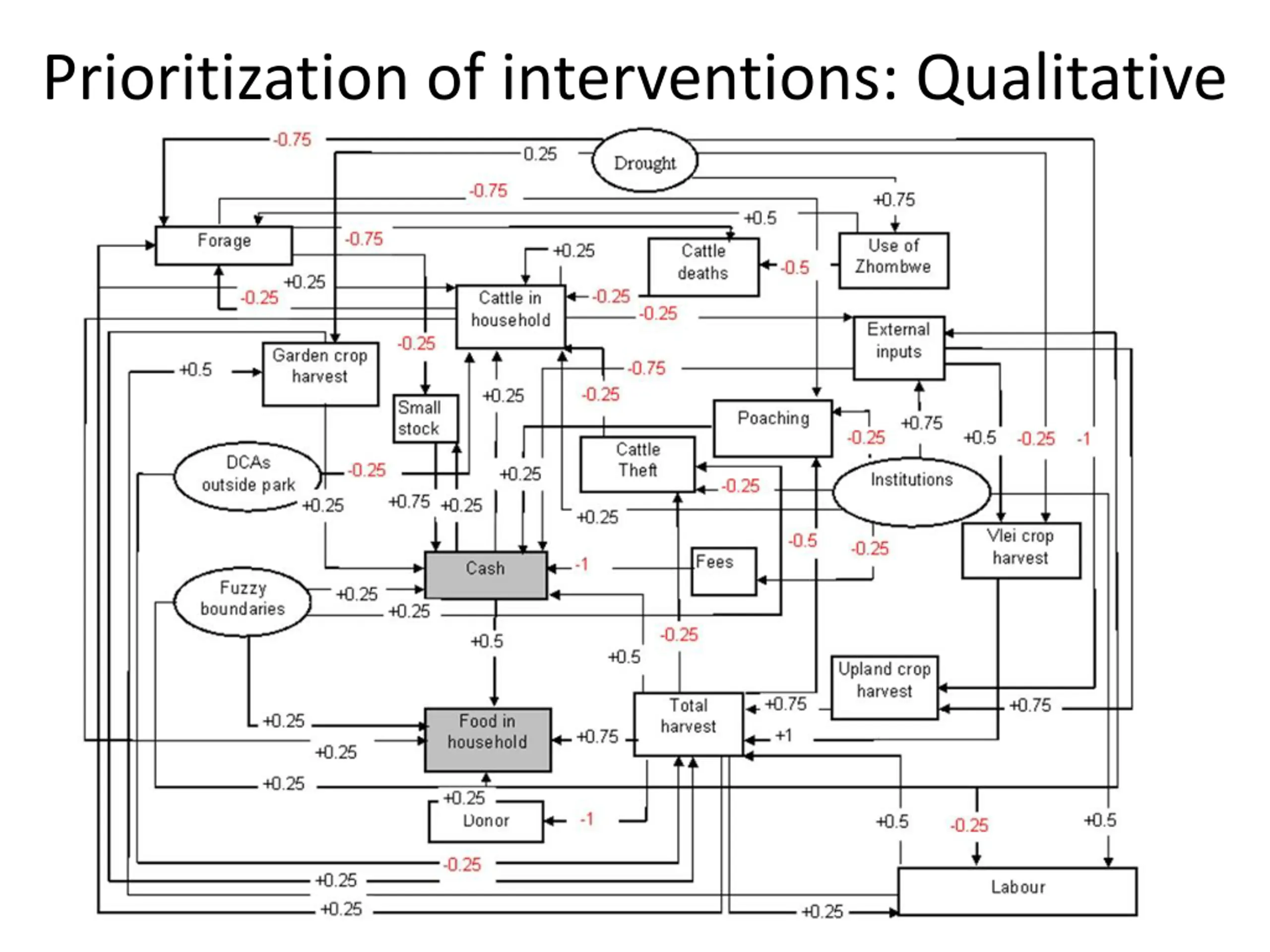 Prioritization of interventions: Qualitative Fuzzy cognitive mapping Semi-quantitative / Qualitative maps of system functioning Relationships must be specified Qualitative consequences of interventions can be calculated through with these maps Powerful way to take into account uncertain and qualitative knowledge