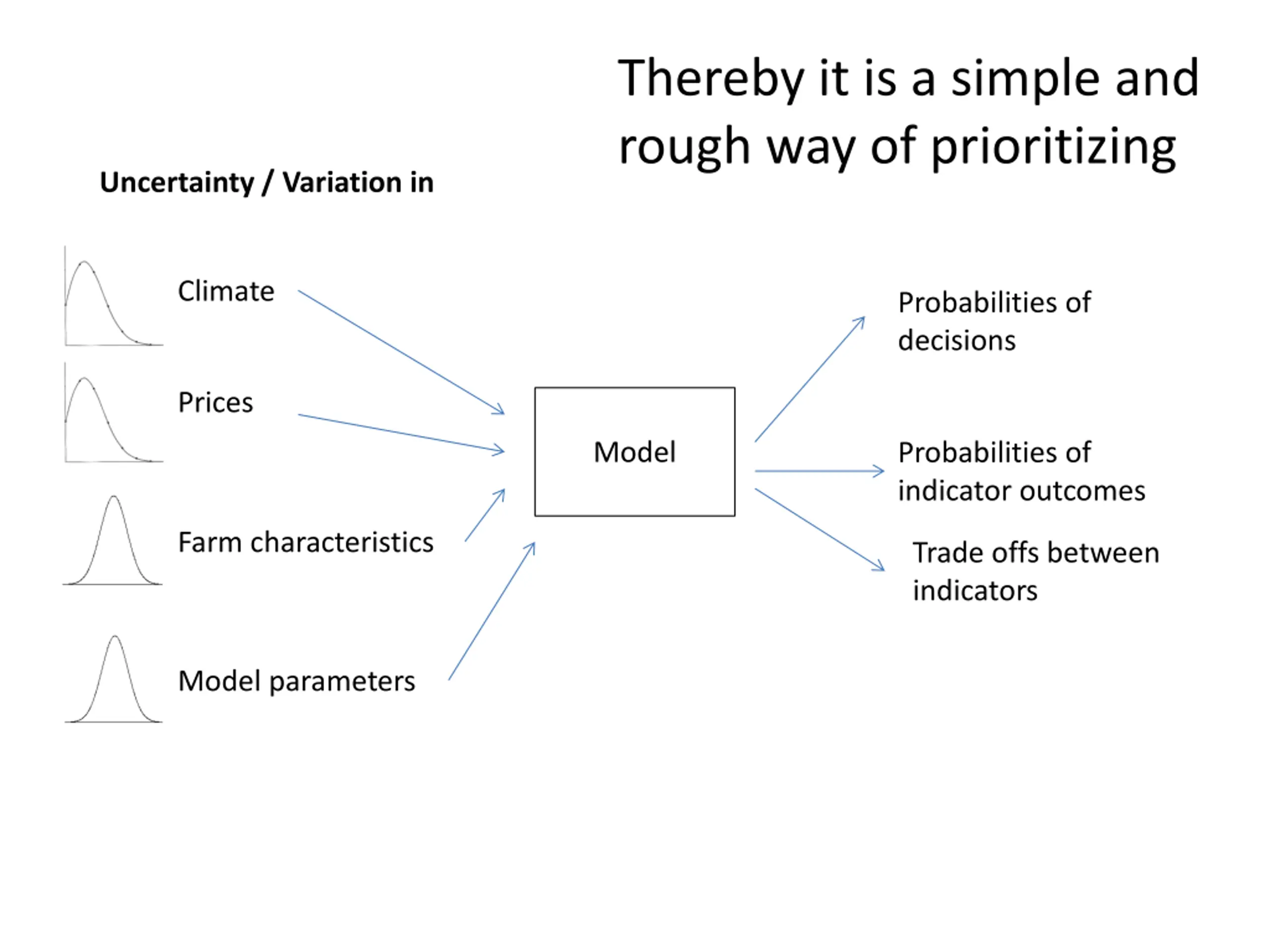 Thereby it is a simple and rough way of prioritizing Uncertainty / Variation in Climate Probabilities of decisions Prices Model Probabilities of indicator outcomes Farm characteristics Trade offs between indicators Model parameters