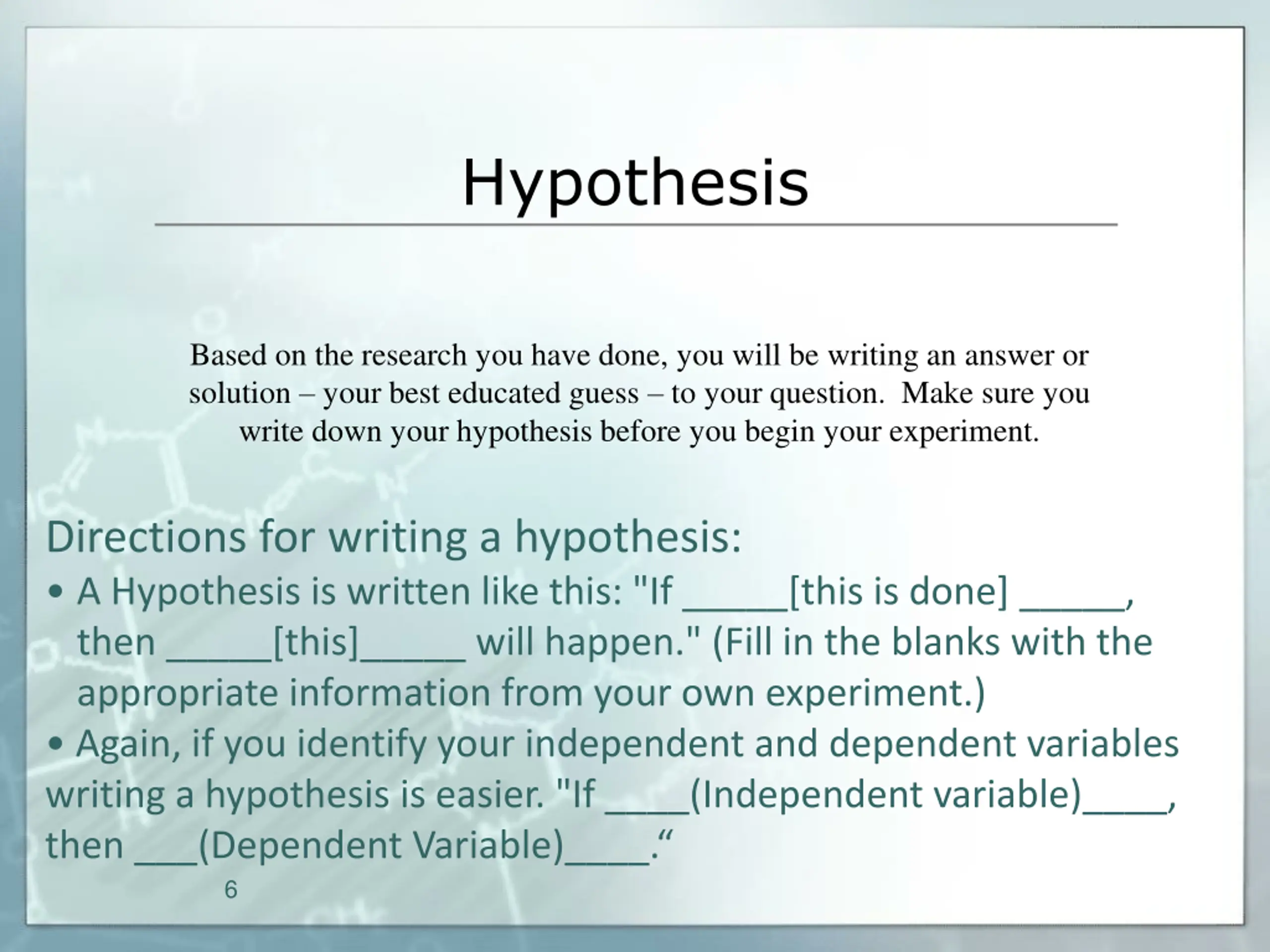Hypothesis Based on the research you have done, you will be writing an answer or solution your best educated guess to your question. Make sure you write down your hypothesis before you begin your experiment. Directions for writing a hypothesis: A Hypothesis is written like this: "If _____[this is done] _____, then _____[this]_____ will happen." (Fill in the blanks with the appropriate information from your own experiment.) Again, if you identify your independent and dependent variables writing a hypothesis is easier. "If ____(Independent variable)____, then ___(Dependent Variable)____. 6
