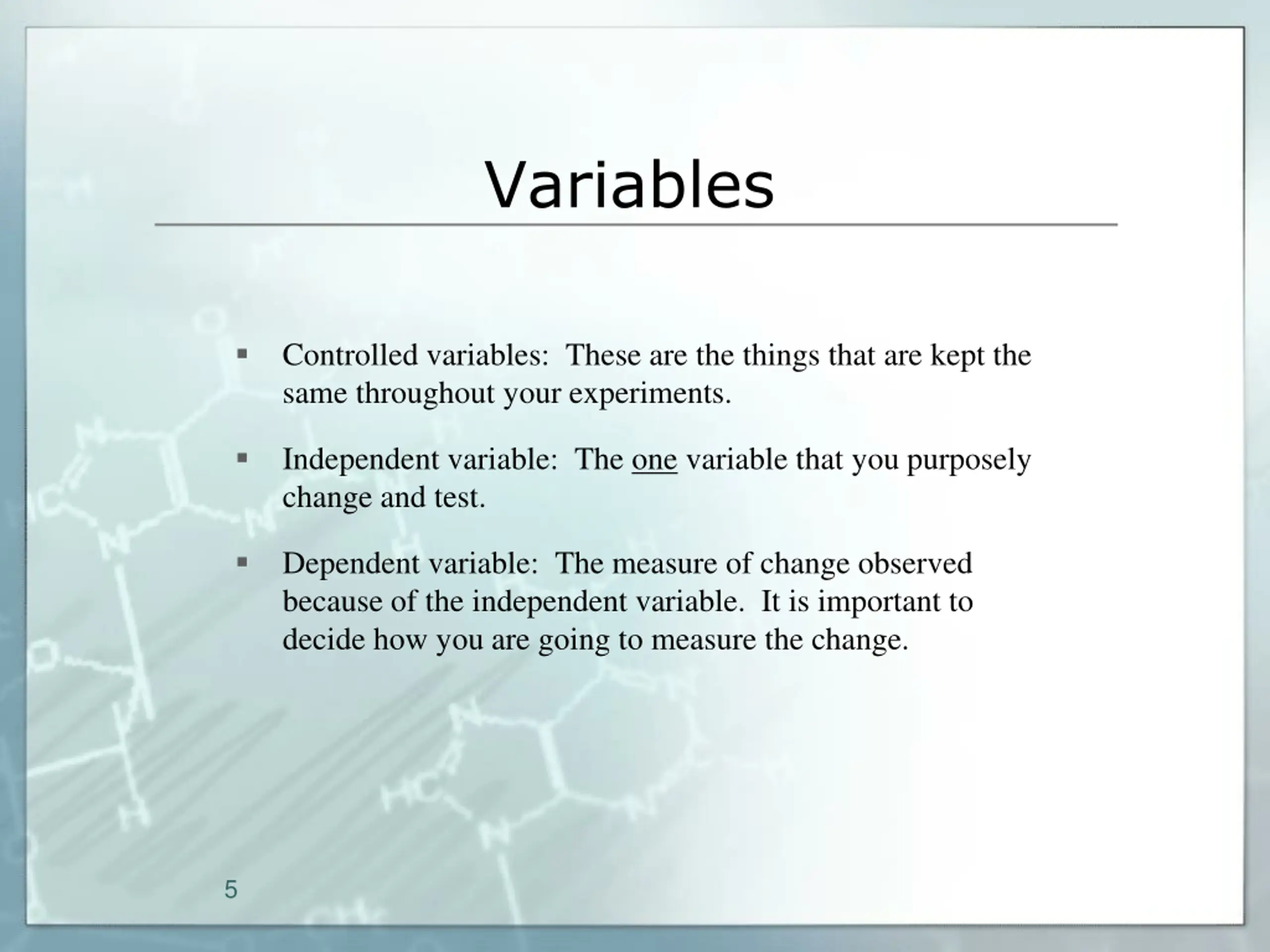 Variables Controlled variables: These are the things that are kept the same throughout your experiments. Independent variable: The one variable that you purposely change and test. Dependent variable: The measure of change observed because of the independent variable. It is important to decide how you are going to measure the change. 5