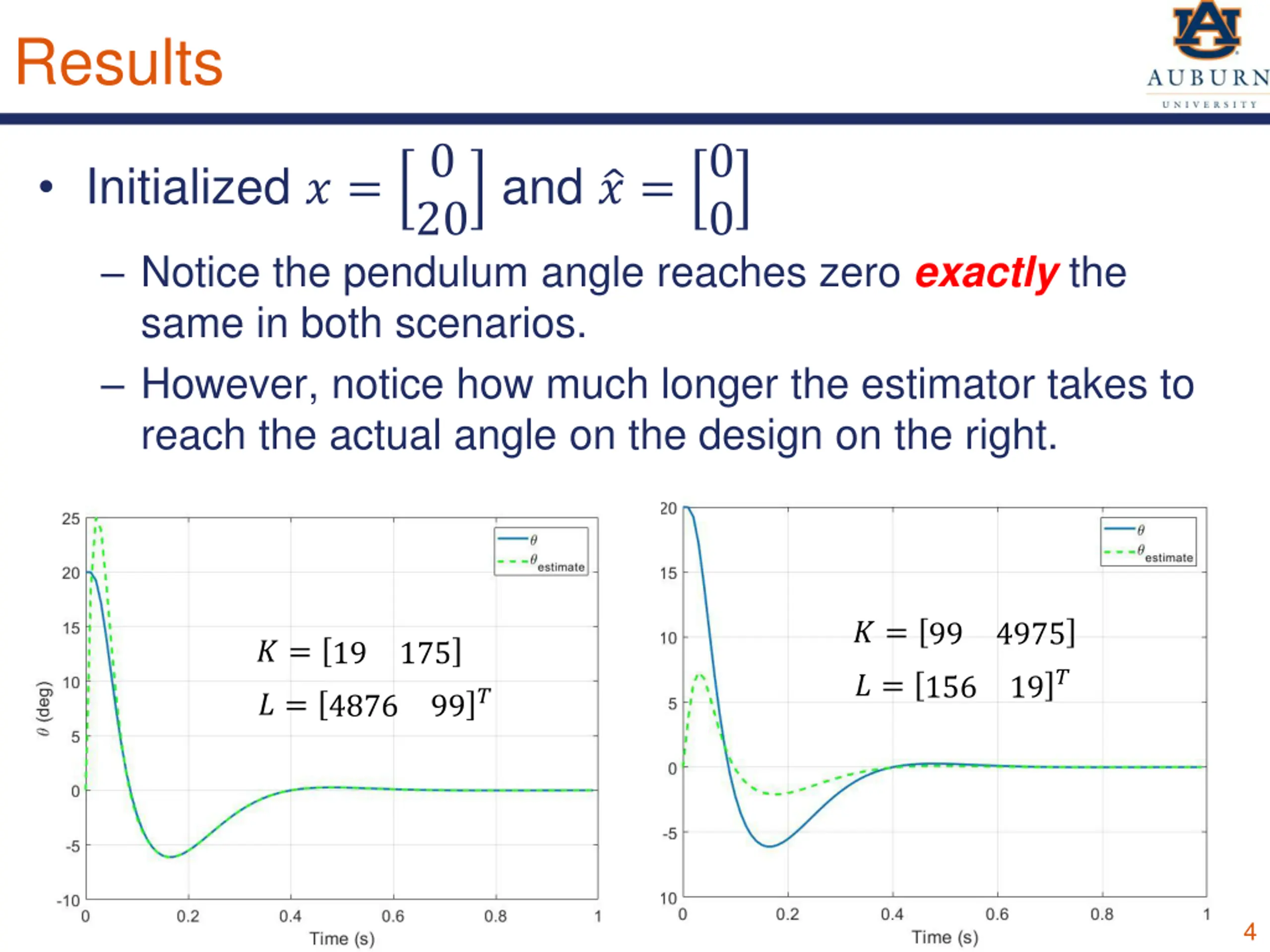 Results 20 and ? =0 0 Initialized ? = 0 Notice the pendulum angle reaches zero exactly the same in both scenarios. However, notice how much longer the estimator takes to reach the actual angle on the design on the right. ? = 99 4975 19? ? = 19 175 ? = 156 99? ? = 4876 4