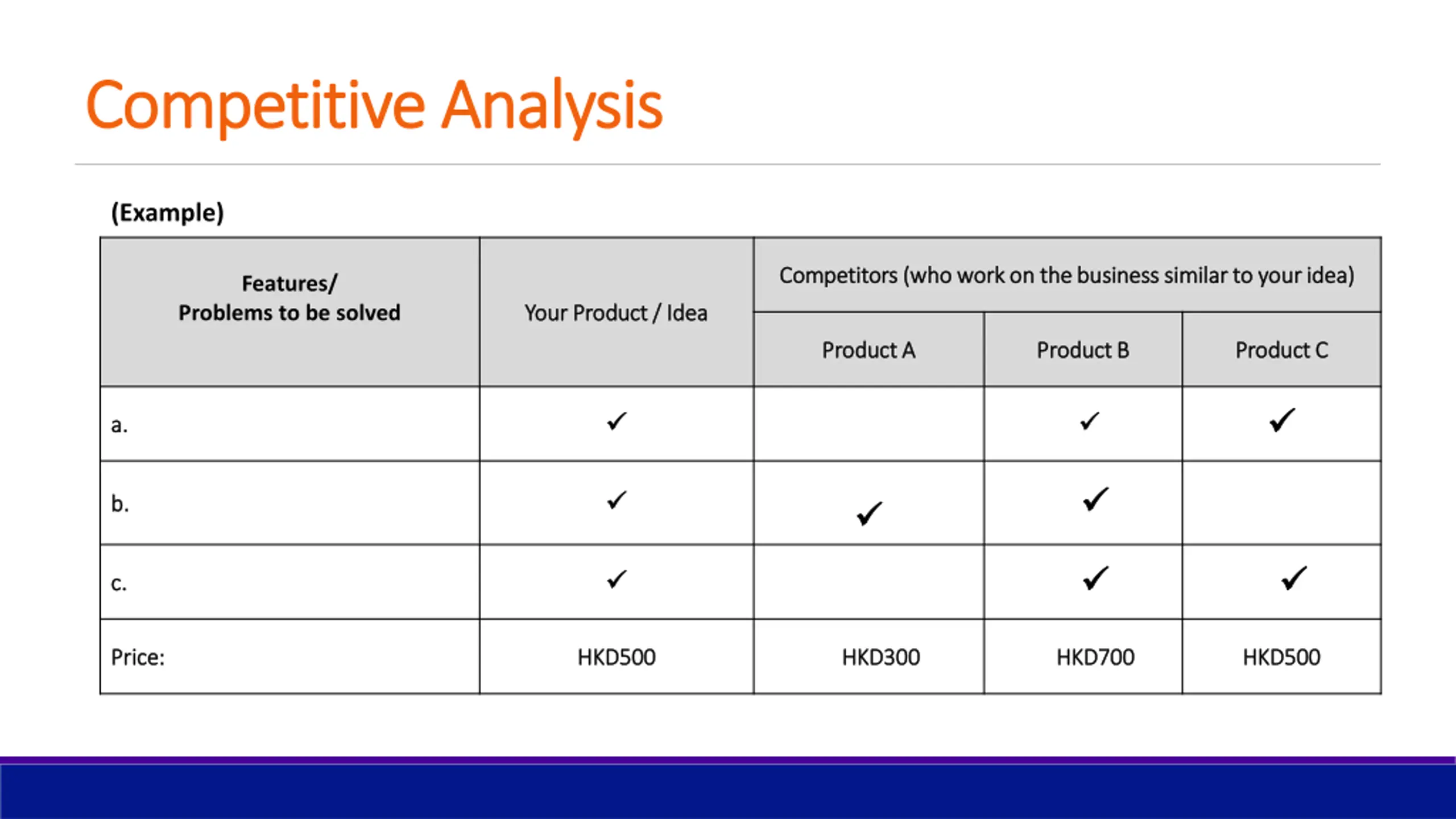 Competitive Analysis Competitive Analysis (Example) Competitors (who work on the business similar to your idea) Competitors (who work on the business similar to your idea) Features/ Problems to be solved Your Product / Idea Your Product / Idea Product A Product A Product B Product B Product C Product C a. a. b. b. c. c. Price: Price: HKD500 HKD500 HKD300 HKD300 HKD700 HKD700 HKD500 HKD500