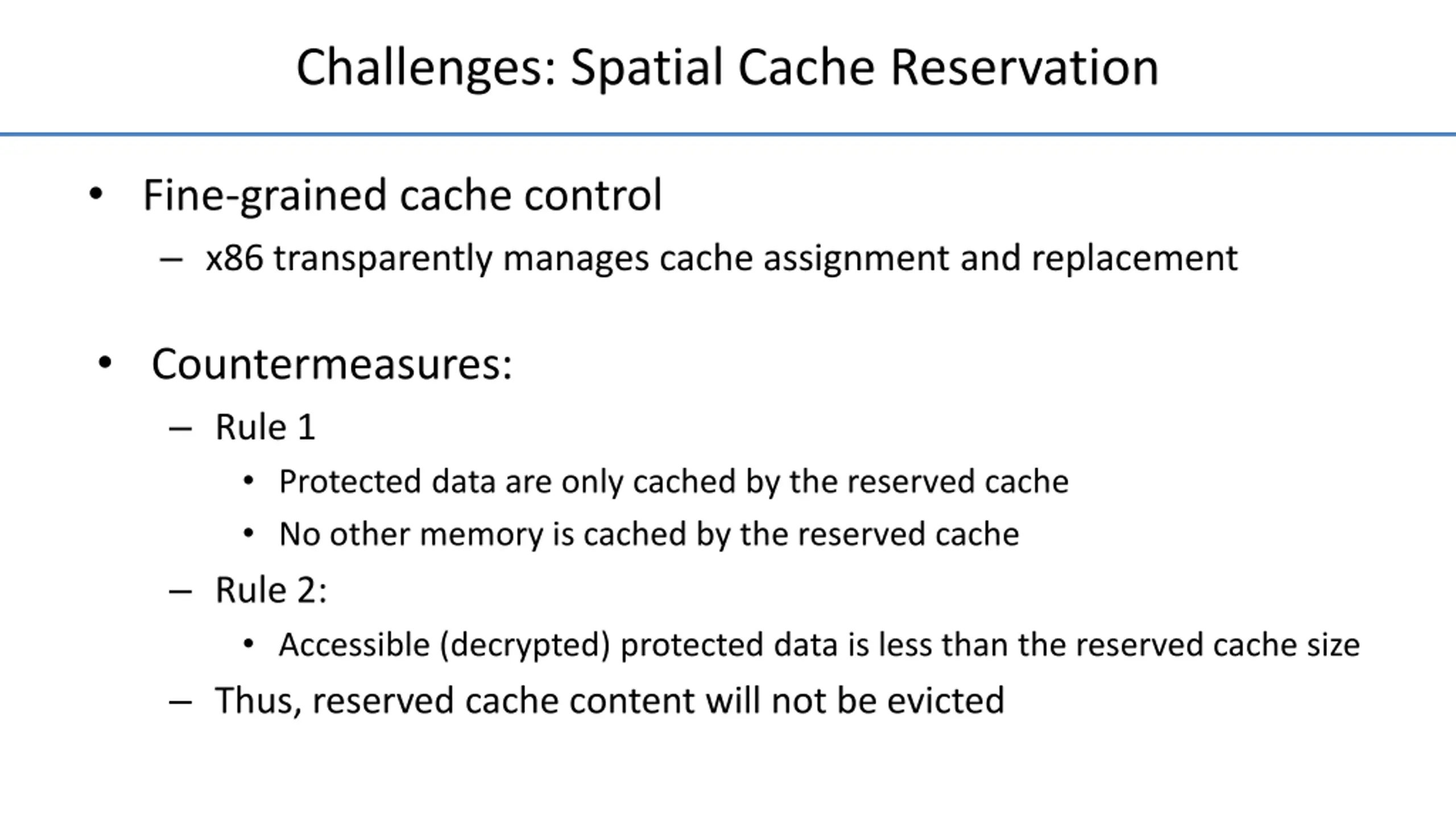 Challenges: Spatial Cache Reservation Fine-grained cache control x86 transparently manages cache assignment and replacement Countermeasures: Rule 1 Protected data are only cached by the reserved cache No other memory is cached by the reserved cache Rule 2: Accessible (decrypted) protected data is less than the reserved cache size Thus, reserved cache content will not be evicted