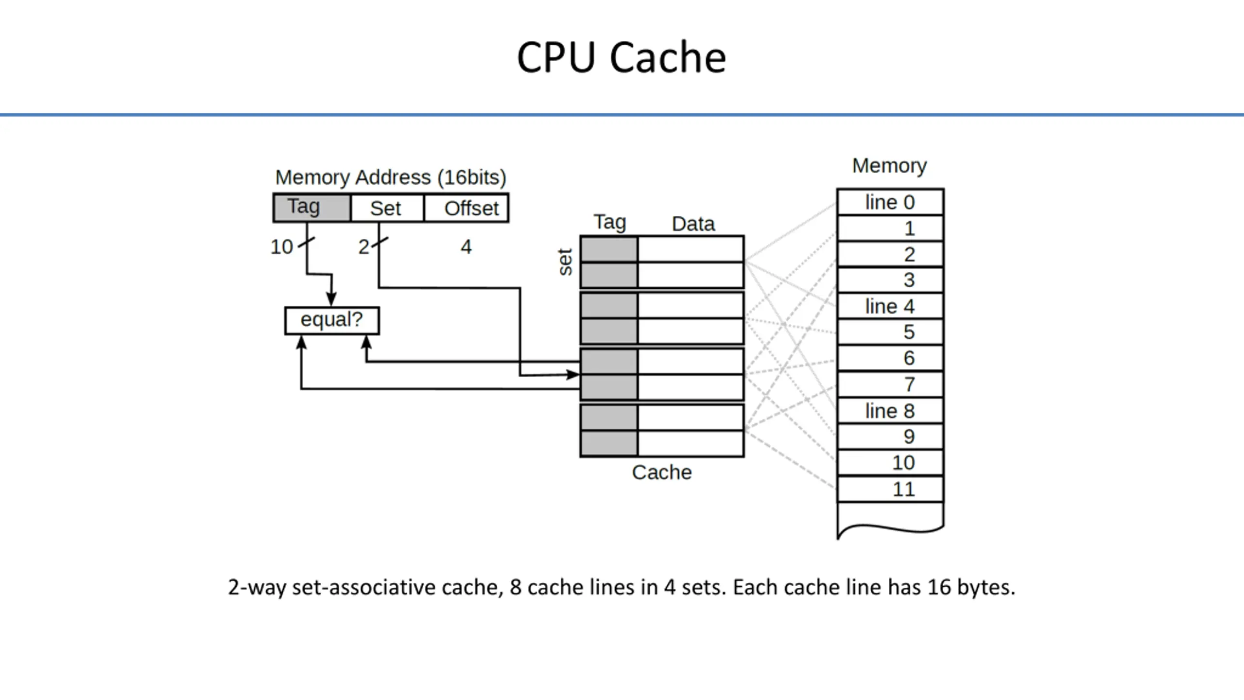 CPU Cache 2-way set-associative cache, 8 cache lines in 4 sets. Each cache line has 16 bytes.
