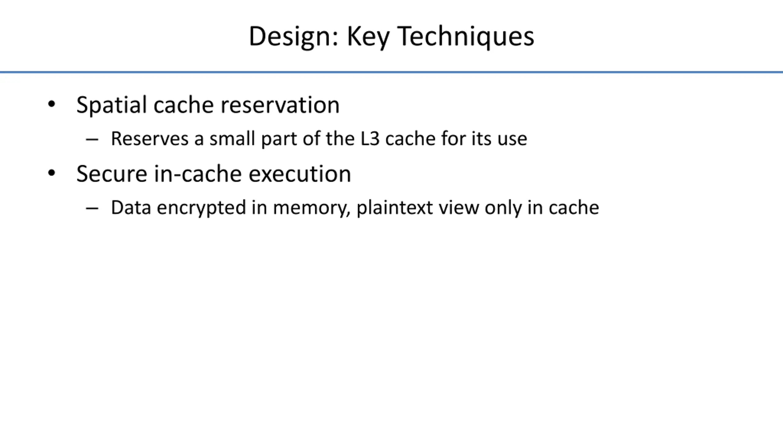 Design: Key Techniques Spatial cache reservation Reserves a small part of the L3 cache for its use Secure in-cache execution Data encrypted in memory, plaintext view only in cache