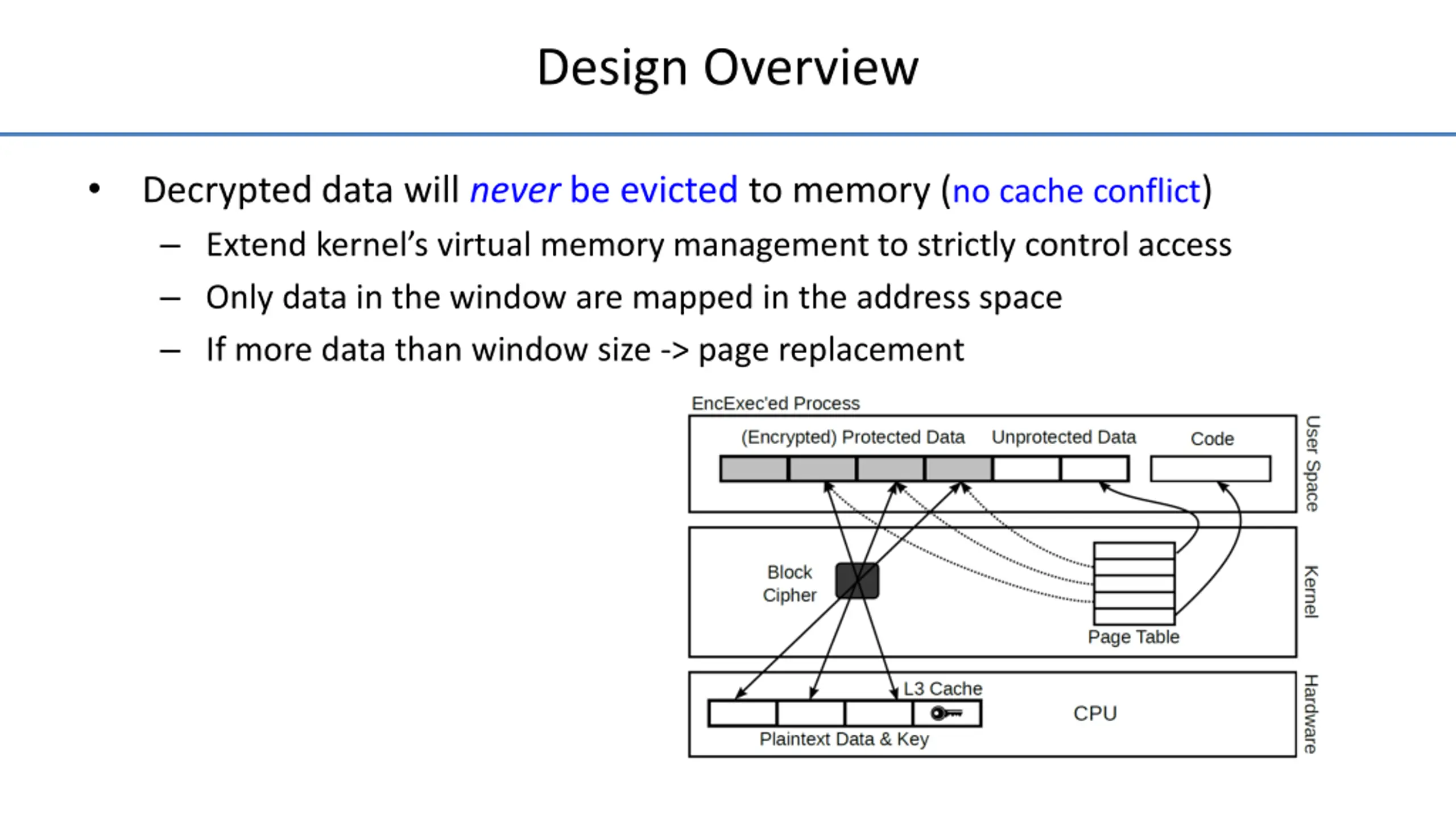 Design Overview Decrypted data will never be evicted to memory (no cache conflict) Extend kernel s virtual memory management to strictly control access Only data in the window are mapped in the address space If more data than window size -> page replacement