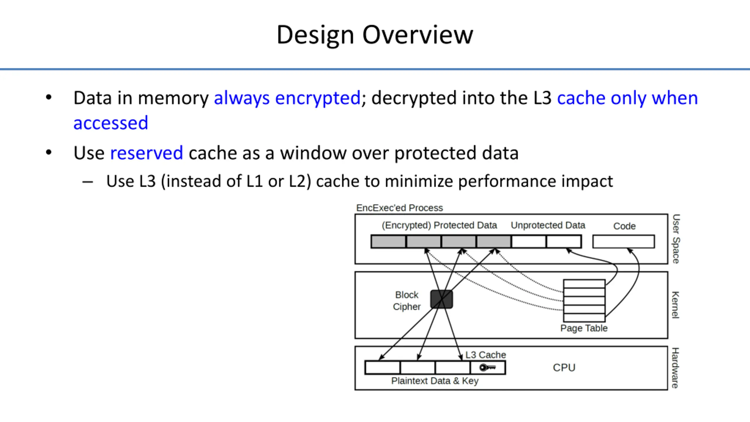Design Overview Data in memory always encrypted; decrypted into the L3 cache only when accessed Use reserved cache as a window over protected data Use L3 (instead of L1 or L2) cache to minimize performance impact