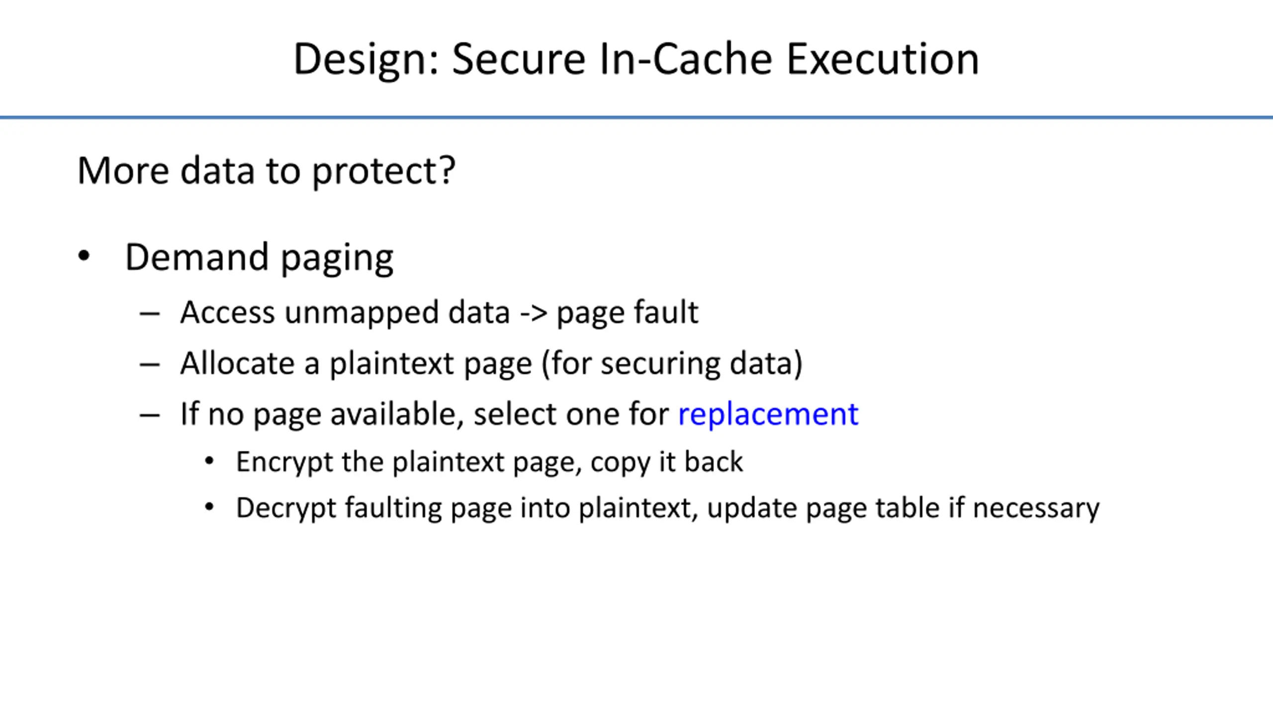 Design: Secure In-Cache Execution More data to protect? Demand paging Access unmapped data -> page fault Allocate a plaintext page (for securing data) If no page available, select one for replacement Encrypt the plaintext page, copy it back Decrypt faulting page into plaintext, update page table if necessary