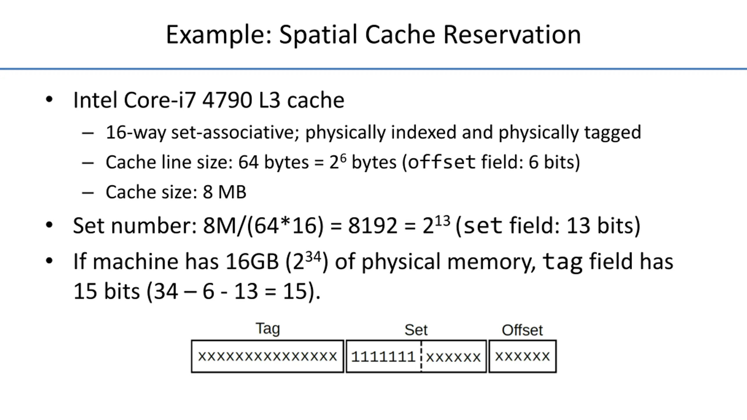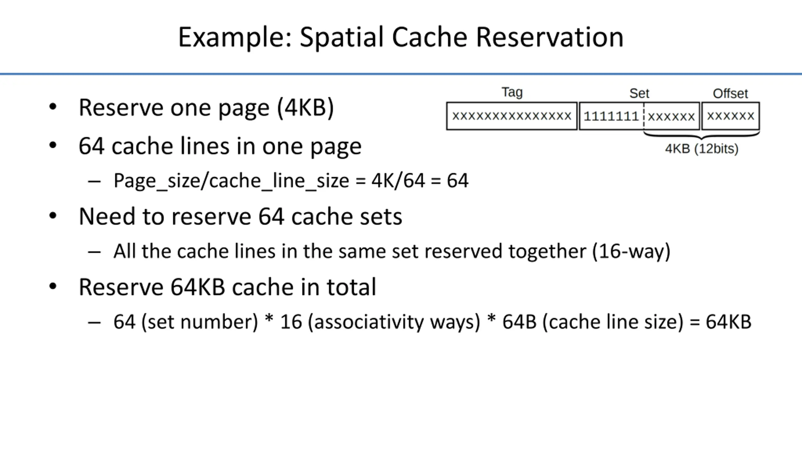 Example: Spatial Cache Reservation Intel Core-i7 4790 L3 cache 16-way set-associative; physically indexed and physically tagged Cache line size: 64 bytes = 26bytes (offset field: 6 bits) Cache size: 8 MB Set number: 8M/(64*16) = 8192 = 213 (set field: 13 bits) If machine has 16GB (234) of physical memory, tag field has 15 bits (34 6 - 13 = 15).