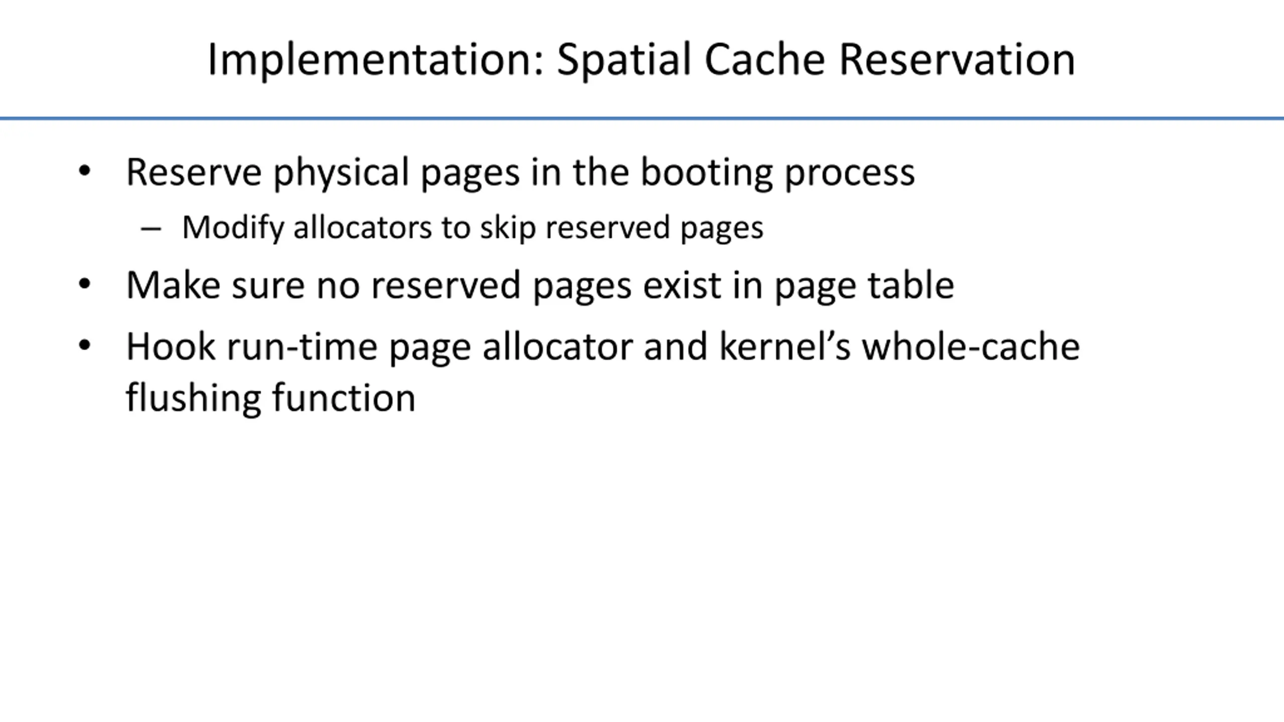 Implementation: Spatial Cache Reservation Reserve physical pages in the booting process Modify allocators to skip reserved pages Make sure no reserved pages exist in page table Hook run-time page allocator and kernel s whole-cache flushing function