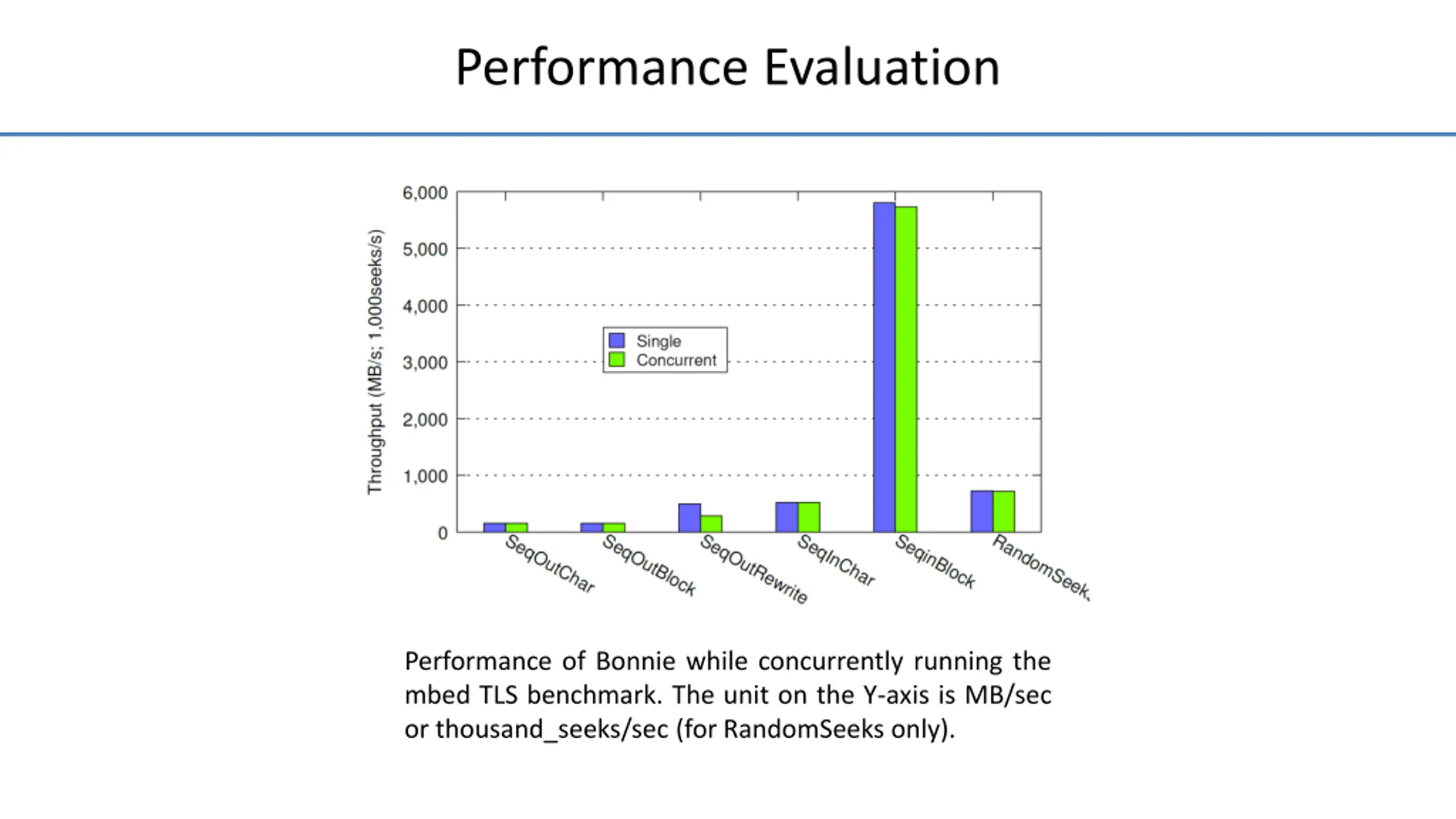 Performance Evaluation Performance of Bonnie while concurrently running the mbed TLS benchmark. The unit on the Y-axis is MB/sec or thousand_seeks/sec (for RandomSeeks only).