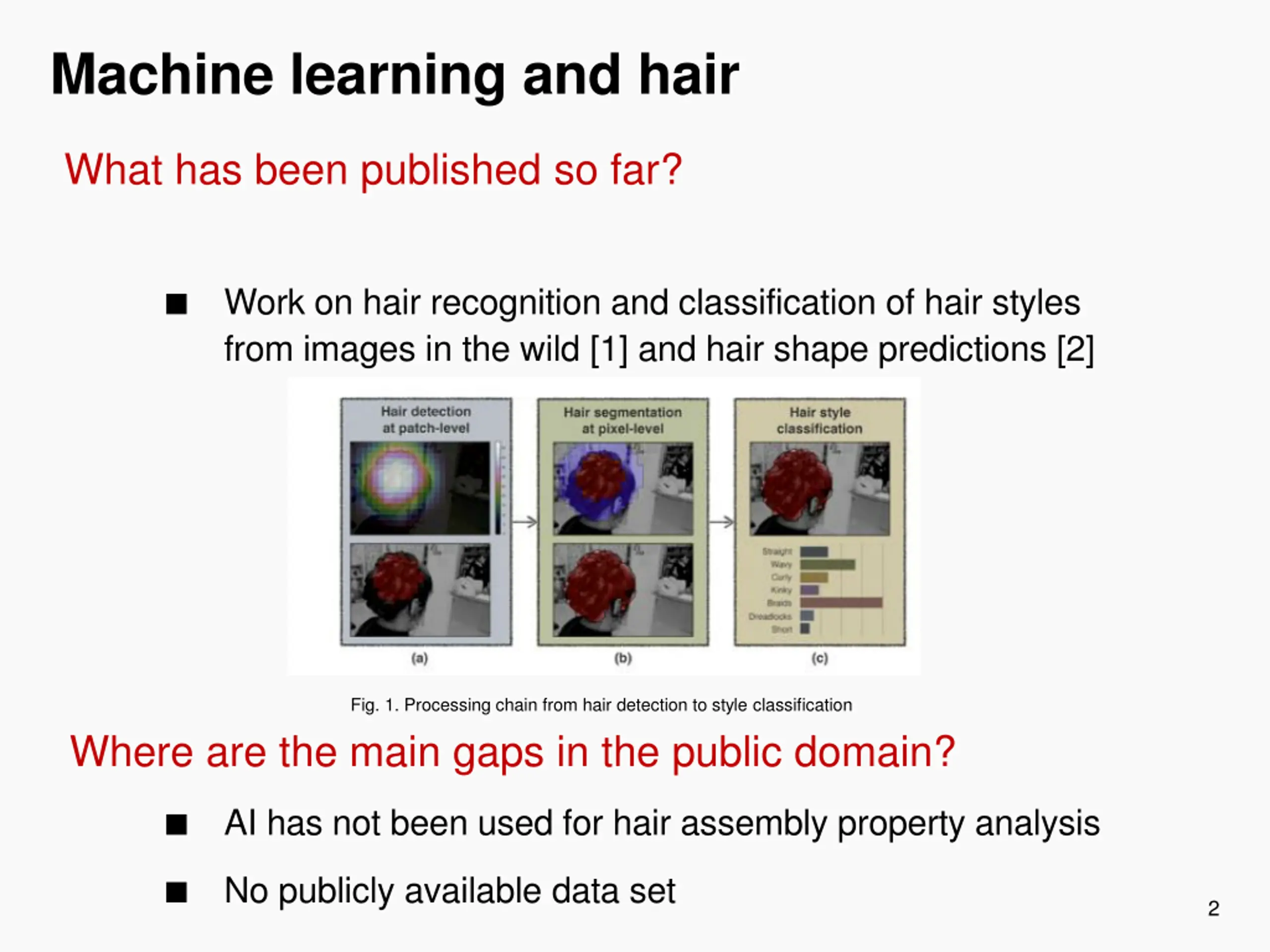 Machine learning and hair What has been published so far? Work on hair recognition and classification of hair styles from images in the wild [1] and hair shape predictions [2] Fig. 1. Processing chain from hair detection to style classification Where are the main gaps in the public domain? AI has not been used for hair assembly property analysis No publicly available data set 2