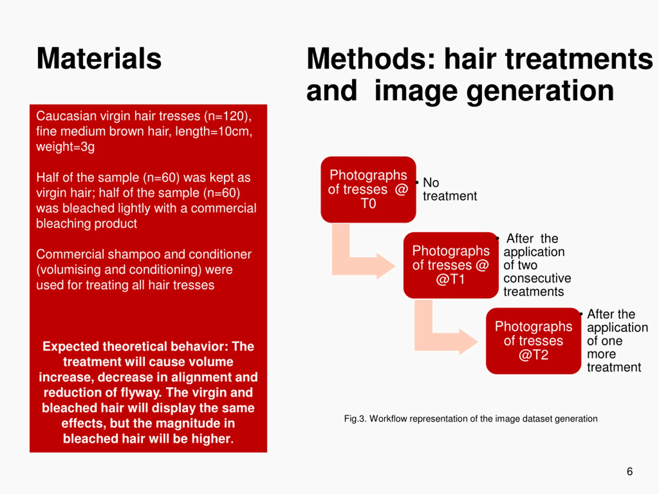 Materials Methods: hair treatments and image generation Caucasian virgin hair tresses (n=120), fine medium brown hair, length=10cm, weight=3g Photographs of tresses @ T0 Half of the sample (n=60) was kept as virgin hair; half of the sample (n=60) was bleached lightly with a commercial bleaching product No treatment After the application of two consecutive treatments Photographs of tresses @ @T1 Commercial shampoo and conditioner (volumising and conditioning) were used for treating all hair tresses After the application of one more treatment Photographs of tresses @T2 Expected theoretical behavior: The treatment will cause volume increase, decrease in alignment and reduction of flyway. The virgin and bleached hair will display the same effects, but the magnitude in bleached hair will be higher. Fig.3. Workflow representation of the image dataset generation 6