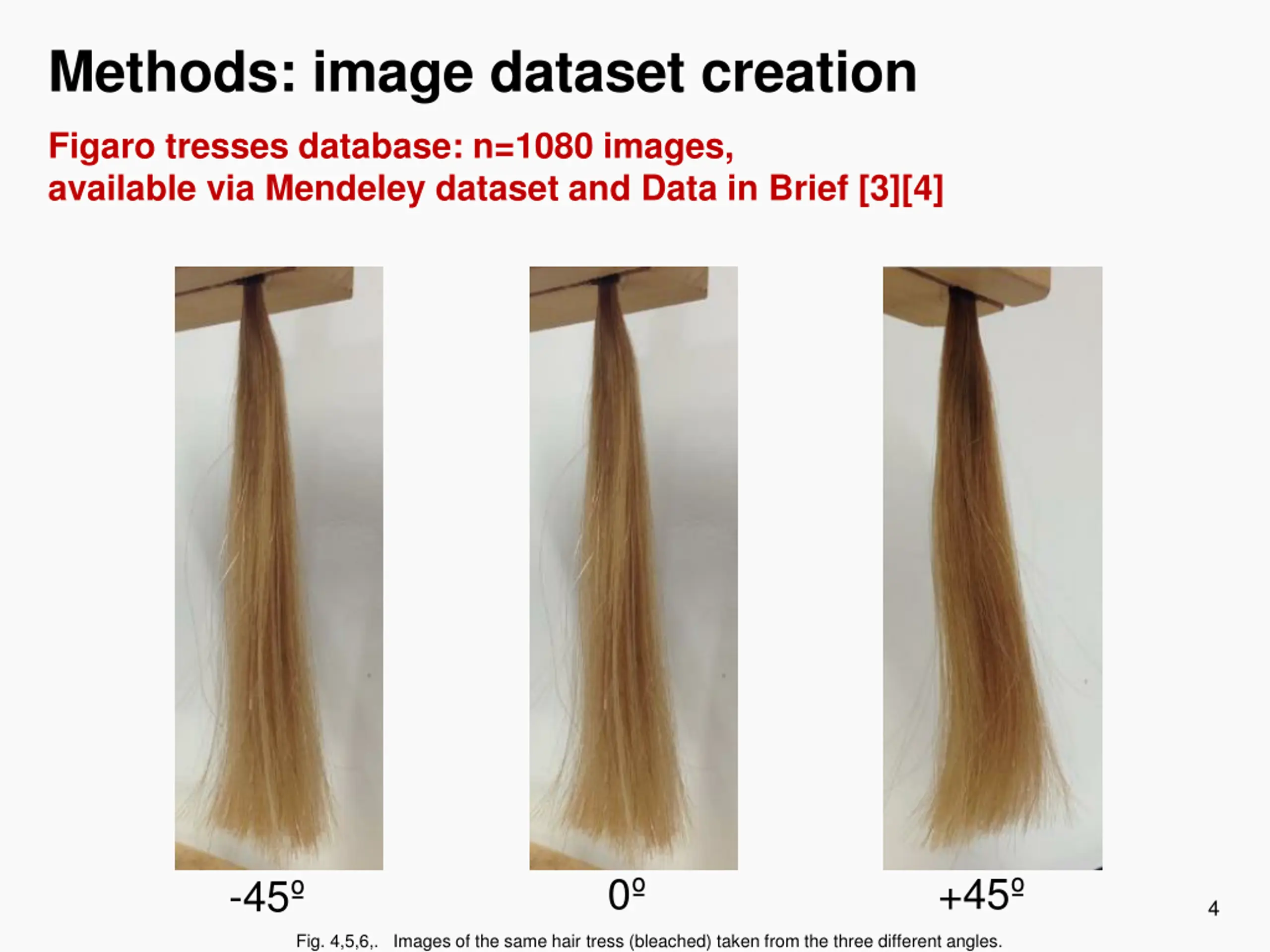Methods: image dataset creation Figaro tresses database: n=1080 images, available via Mendeley dataset and Data in Brief [3][4] 0 +45 -45 4 Fig. 4,5,6,. Images of the same hair tress (bleached) taken from the three different angles.