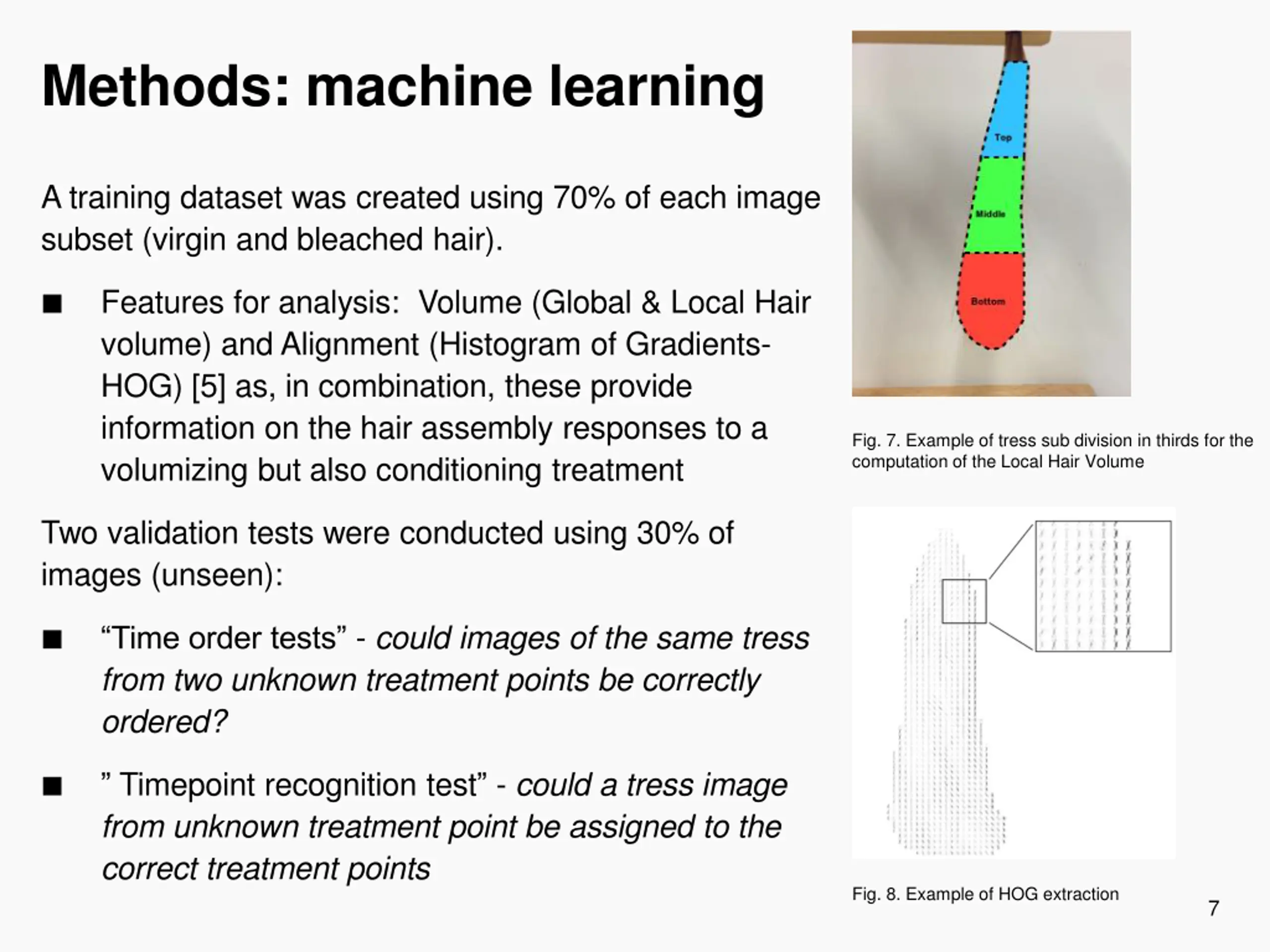 Methods: machine learning A training dataset was created using 70% of each image subset (virgin and bleached hair). Features for analysis: Volume (Global & Local Hair volume) and Alignment (Histogram of Gradients- HOG) [5] as, in combination, these provide information on the hair assembly responses to a volumizing but also conditioning treatment Fig. 7. Example of tress sub division in thirds for the computation of the Local Hair Volume Two validation tests were conducted using 30% of images (unseen): Time order tests - could images of the same tress from two unknown treatment points be correctly ordered? Timepoint recognition test - could a tress image from unknown treatment point be assigned to the correct treatment points Fig. 8. Example of HOG extraction 7