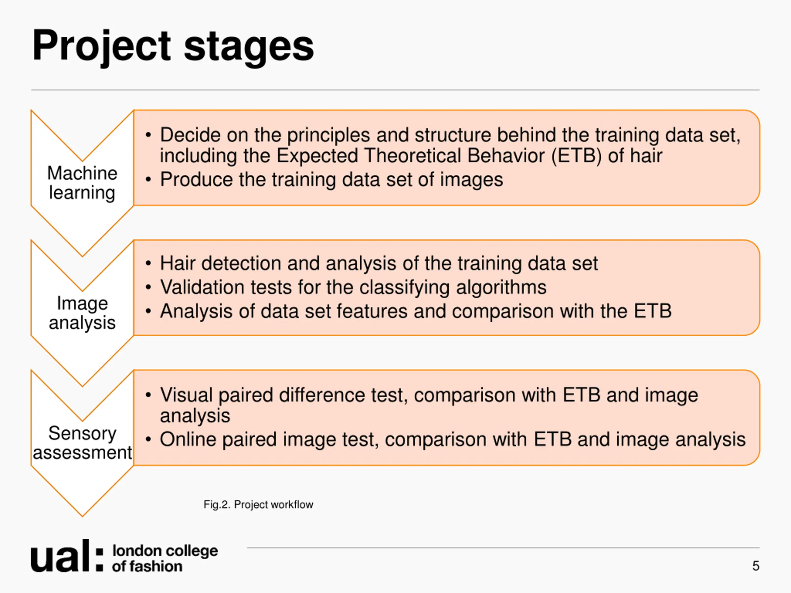 Project stages Decide on the principles and structure behind the training data set, including the Expected Theoretical Behavior (ETB) of hair Produce the training data set of images Machine learning Hair detection and analysis of the training data set Validation tests for the classifying algorithms Analysis of data set features and comparison with the ETB Image analysis Visual paired difference test, comparison with ETB and image analysis Online paired image test, comparison with ETB and image analysis Sensory assessment Fig.2. Project workflow 5