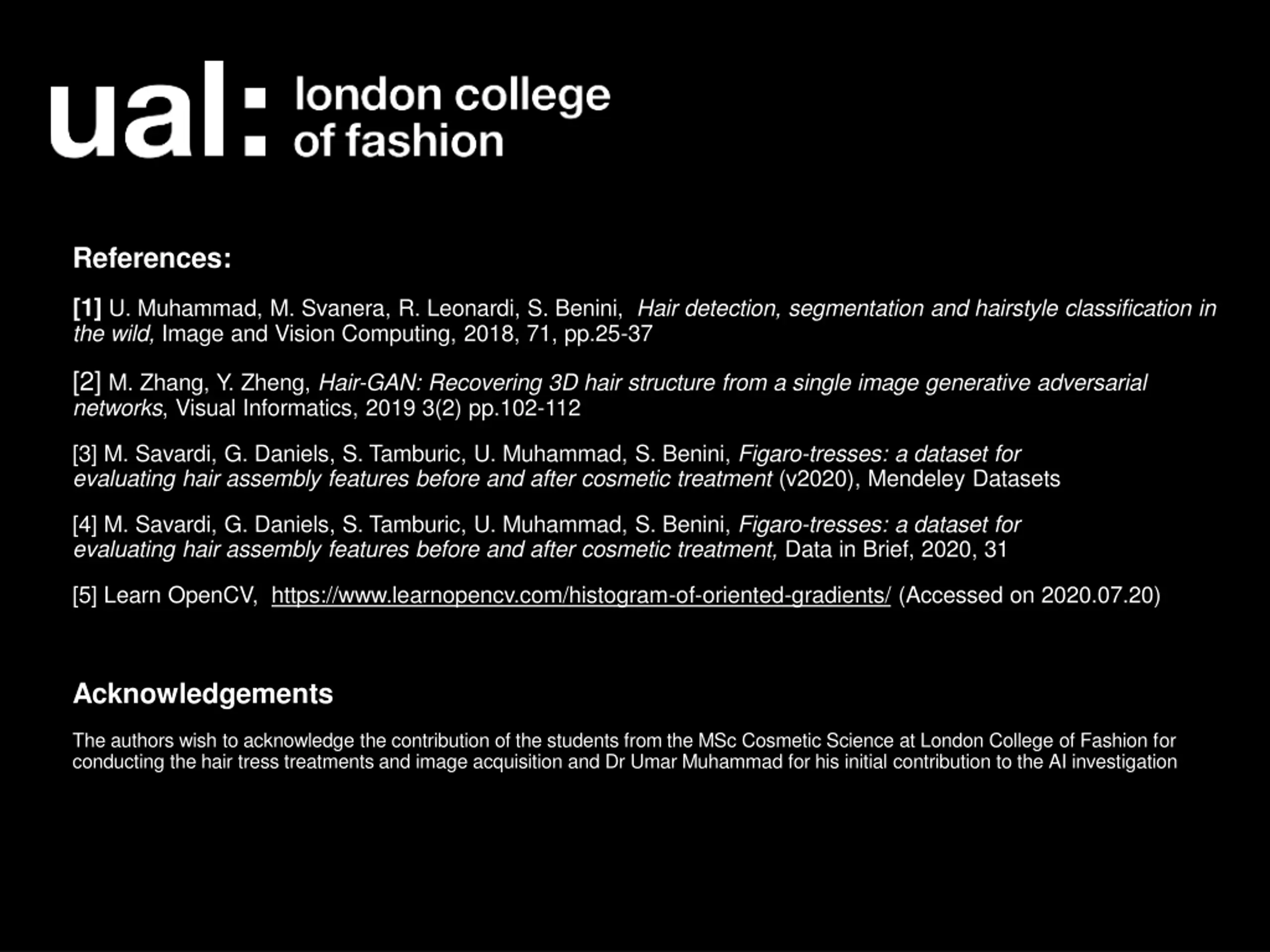 References: [1] U. Muhammad, M. Svanera, R. Leonardi, S. Benini, Hair detection, segmentation and hairstyle classification in the wild, Image and Vision Computing, 2018, 71, pp.25-37 [2] M. Zhang, Y. Zheng, Hair-GAN: Recovering 3D hair structure from a single image generative adversarial networks, Visual Informatics, 2019 3(2) pp.102-112 [3] M. Savardi, G. Daniels, S. Tamburic, U. Muhammad, S. Benini, Figaro-tresses: a dataset for evaluating hair assembly features before and after cosmetic treatment (v2020), Mendeley Datasets [4] M. Savardi, G. Daniels, S. Tamburic, U. Muhammad, S. Benini, Figaro-tresses: a dataset for evaluating hair assembly features before and after cosmetic treatment, Data in Brief, 2020, 31 [5] Learn OpenCV, https://www.learnopencv.com/histogram-of-oriented-gradients/ (Accessed on 2020.07.20) Acknowledgements The authors wish to acknowledge the contribution of the students from the MSc Cosmetic Science at London College of Fashion for conducting the hair tress treatments and image acquisition and Dr Umar Muhammad for his initial contribution to the AI investigation