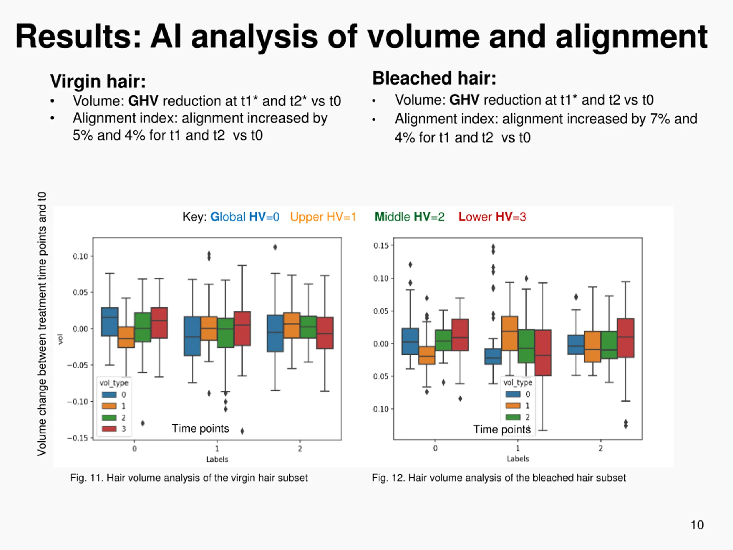 Results: AI analysis of volume and alignment Bleached hair: Volume: GHV reduction at t1* and t2 vs t0 Alignment index: alignment increased by 7% and 4% for t1 and t2 vs t0 Virgin hair: Volume: GHV reduction at t1* and t2* vs t0 Alignment index: alignment increased by 5% and 4% for t1 and t2 vs t0 Volume change between treatment time points and t0 Key: Global HV=0 Upper HV=1 Middle HV=2 Lower HV=3 Time points Time points Fig. 11. Hair volume analysis of the virgin hair subset Fig. 12. Hair volume analysis of the bleached hair subset 10