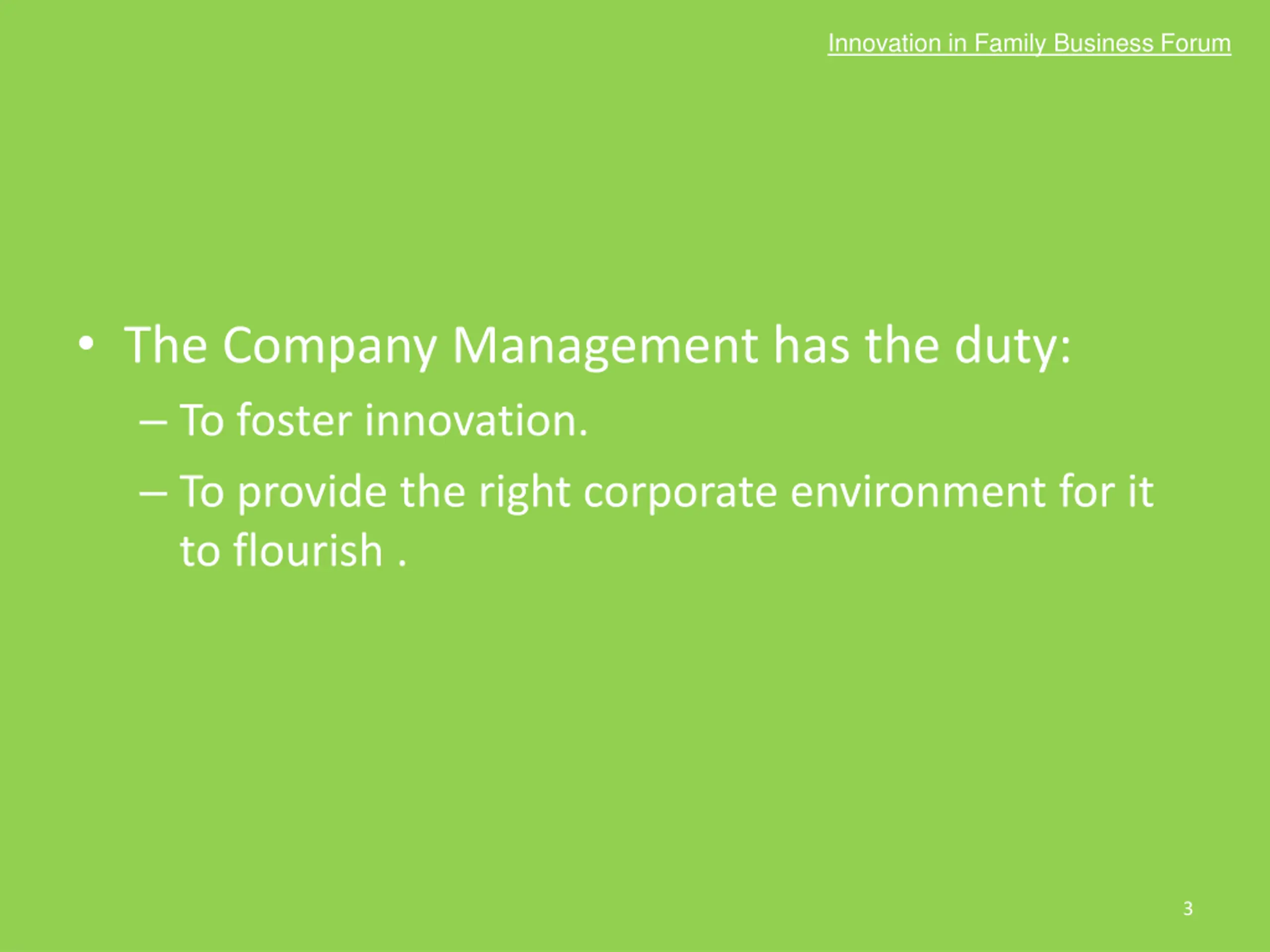 Innovation in Family Business Forum The Company Management has the duty: To foster innovation. To provide the right corporate environment for it to flourish . 3