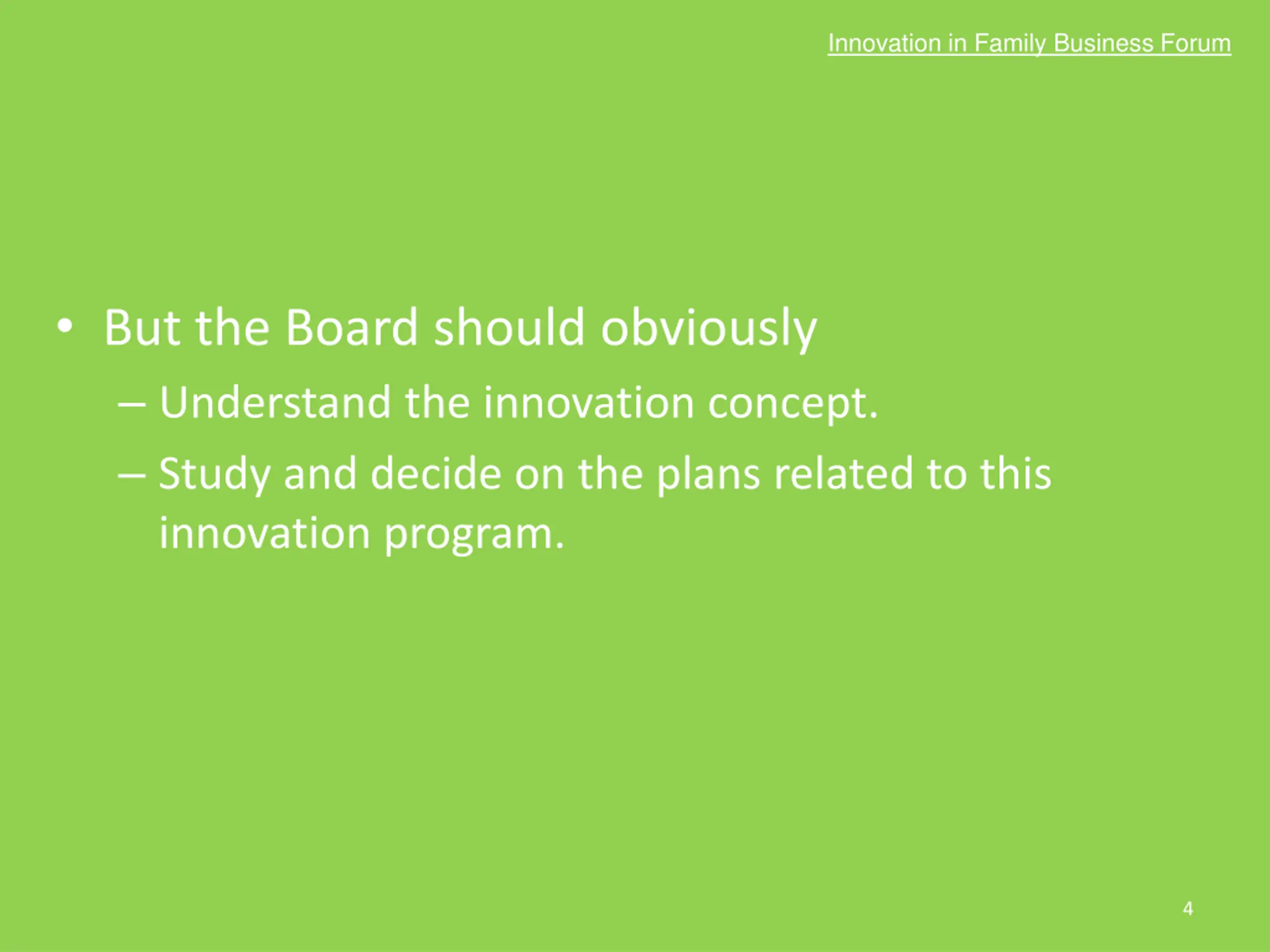 Innovation in Family Business Forum But the Board should obviously Understand the innovation concept. Study and decide on the plans related to this innovation program. 4