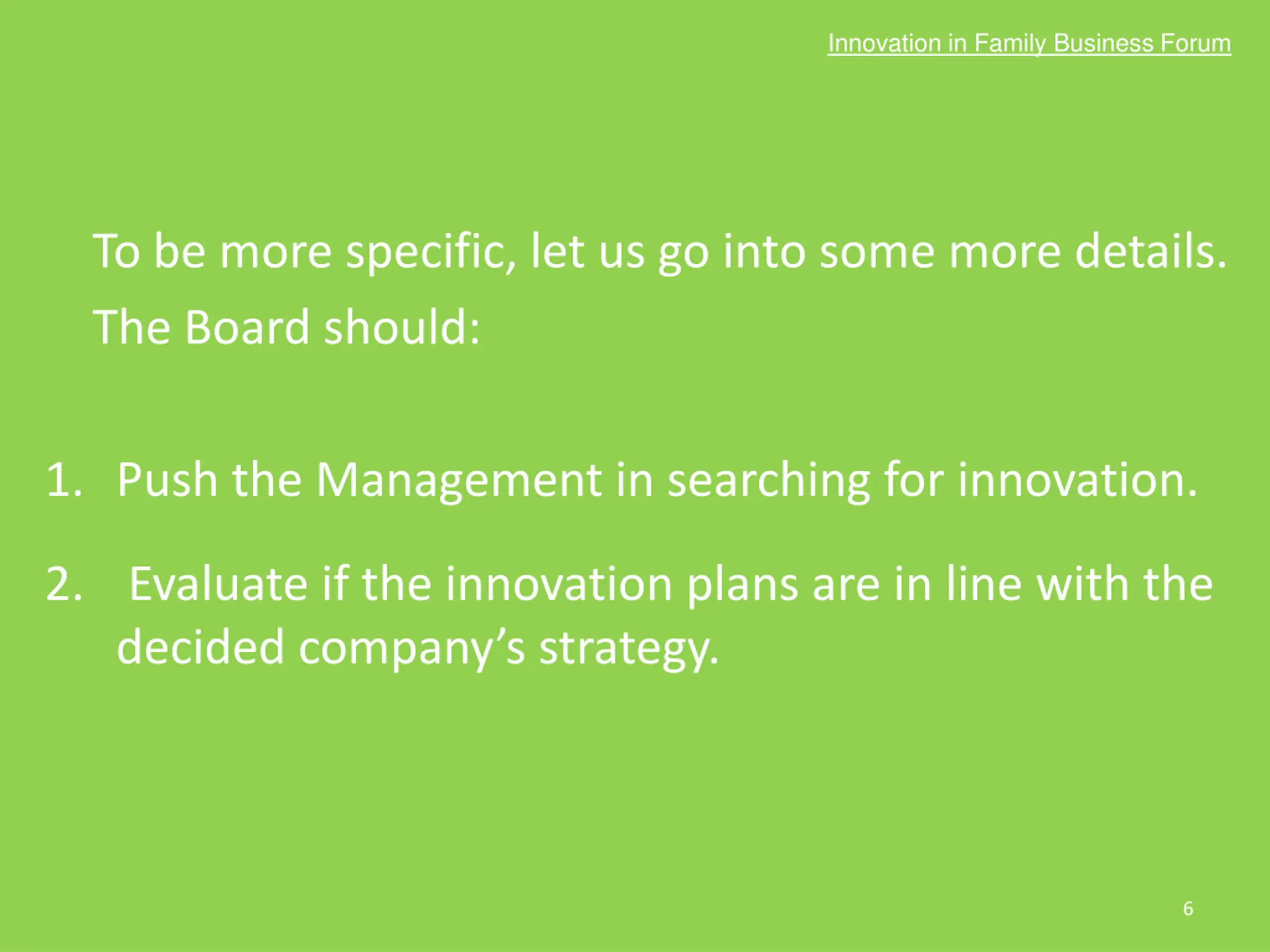 Innovation in Family Business Forum To be more specific, let us go into some more details. The Board should: 1. Push the Management in searching for innovation. 2. Evaluate if the innovation plans are in line with the decided company s strategy. 6