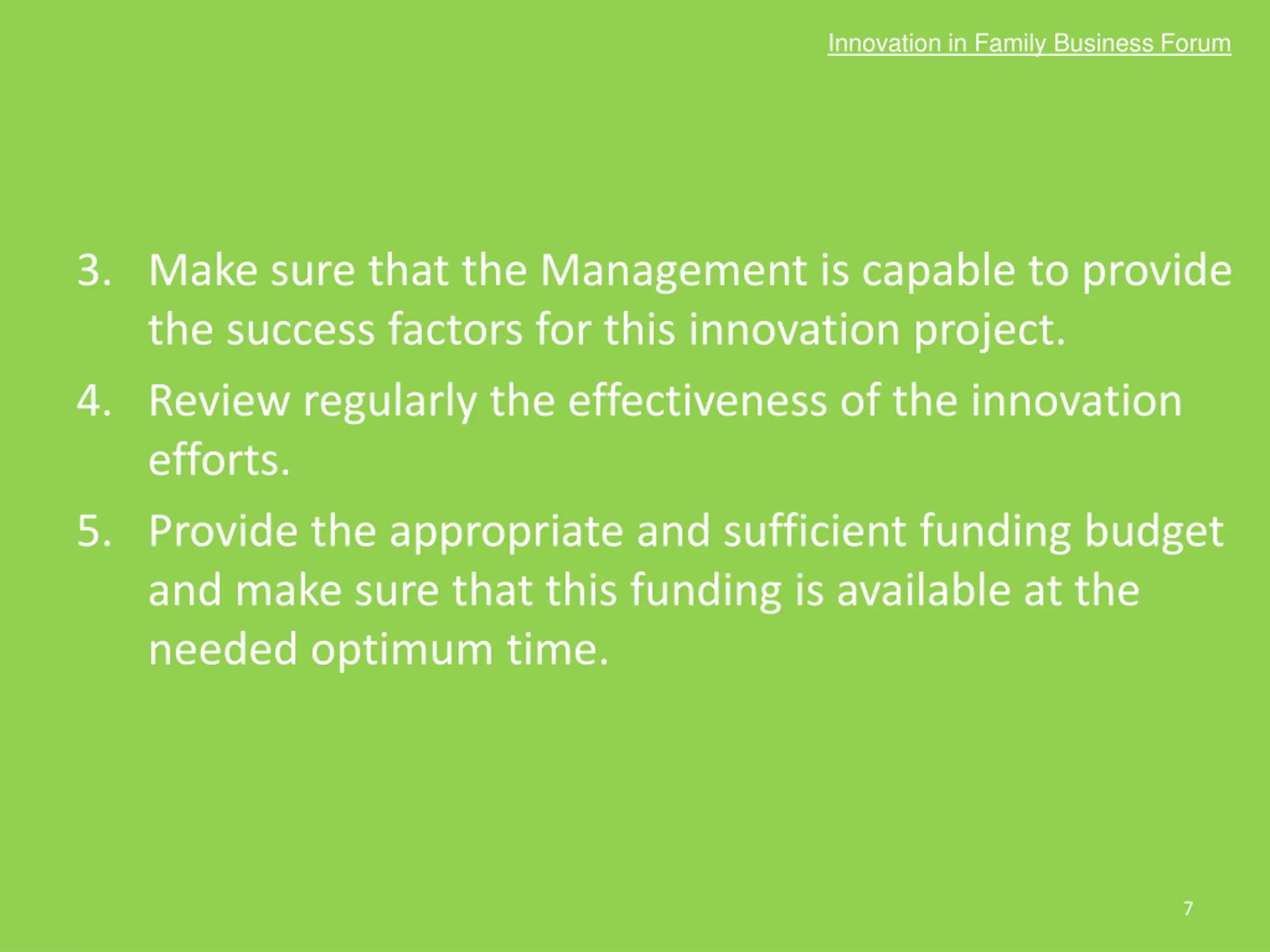 Innovation in Family Business Forum 3. Make sure that the Management is capable to provide the success factors for this innovation project. 4. Review regularly the effectiveness of the innovation efforts. 5. Provide the appropriate and sufficient funding budget and make sure that this funding is available at the needed optimum time. 7