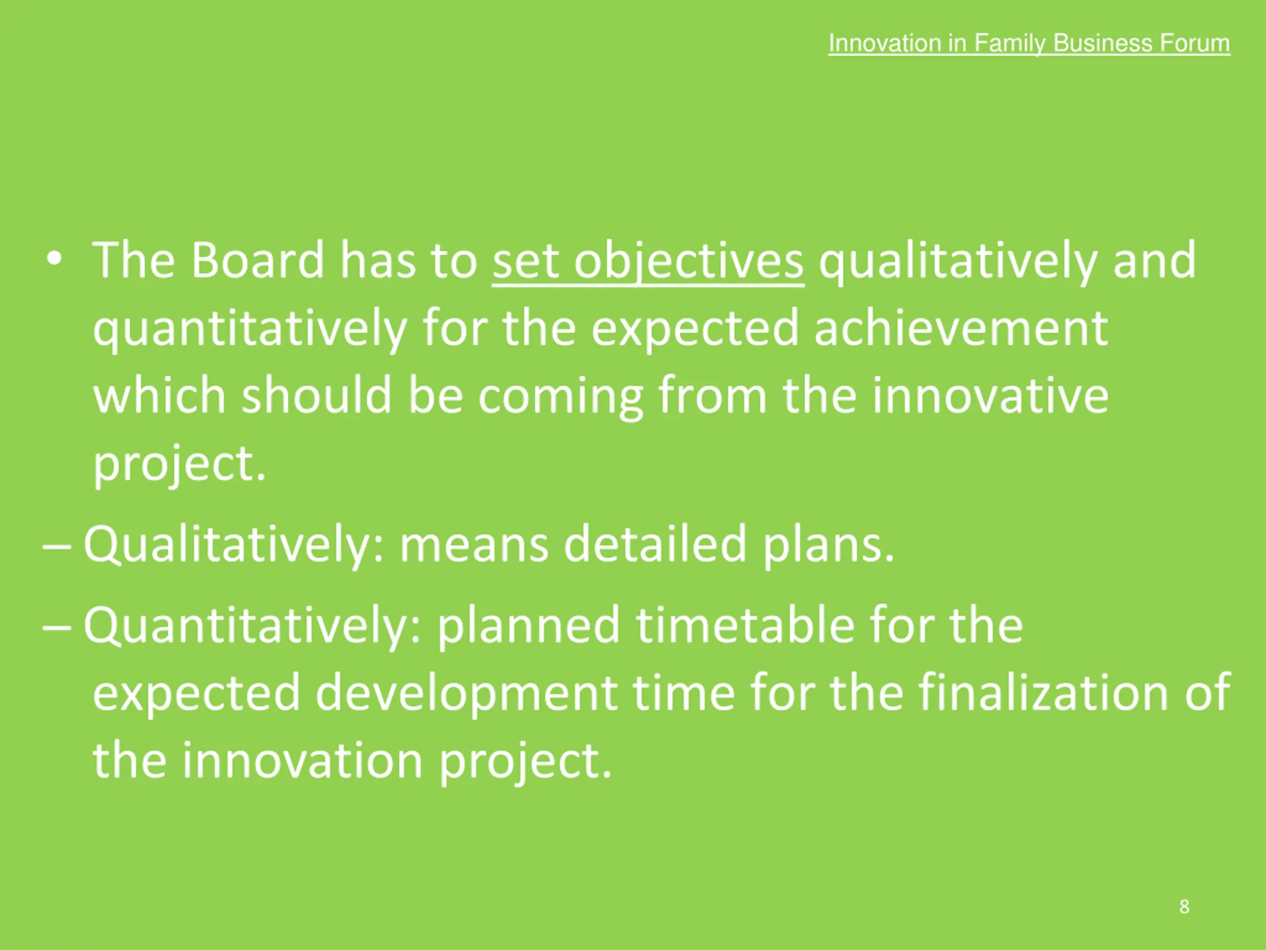 Innovation in Family Business Forum The Board has to set objectives qualitatively and quantitatively for the expected achievement which should be coming from the innovative project. Qualitatively: means detailed plans. Quantitatively: planned timetable for the expected development time for the finalization of the innovation project. 8