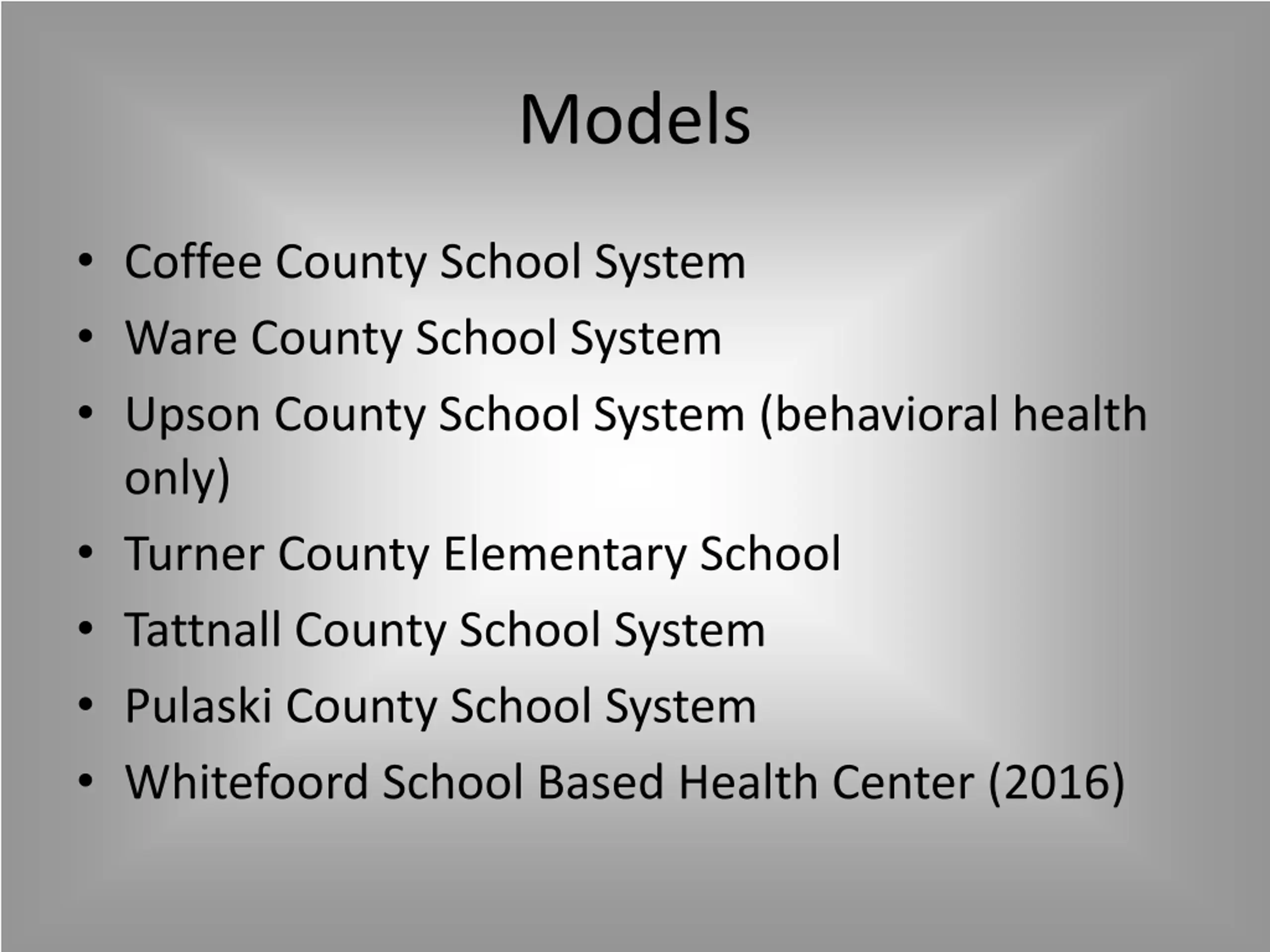 Models Coffee County School System Ware County School System Upson County School System (behavioral health only) Turner County Elementary School Tattnall County School System Pulaski County School System Whitefoord School Based Health Center (2016)
