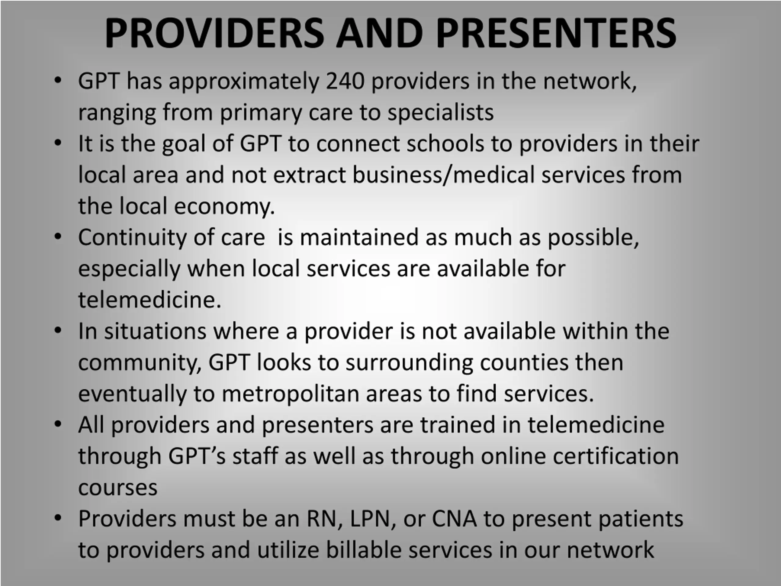 PROVIDERS AND PRESENTERS GPT has approximately 240 providers in the network, ranging from primary care to specialists It is the goal of GPT to connect schools to providers in their local area and not extract business/medical services from the local economy. Continuity of care is maintained as much as possible, especially when local services are available for telemedicine. In situations where a provider is not available within the community, GPT looks to surrounding counties then eventually to metropolitan areas to find services. All providers and presenters are trained in telemedicine through GPT s staff as well as through online certification courses Providers must be an RN, LPN, or CNA to present patients to providers and utilize billable services in our network