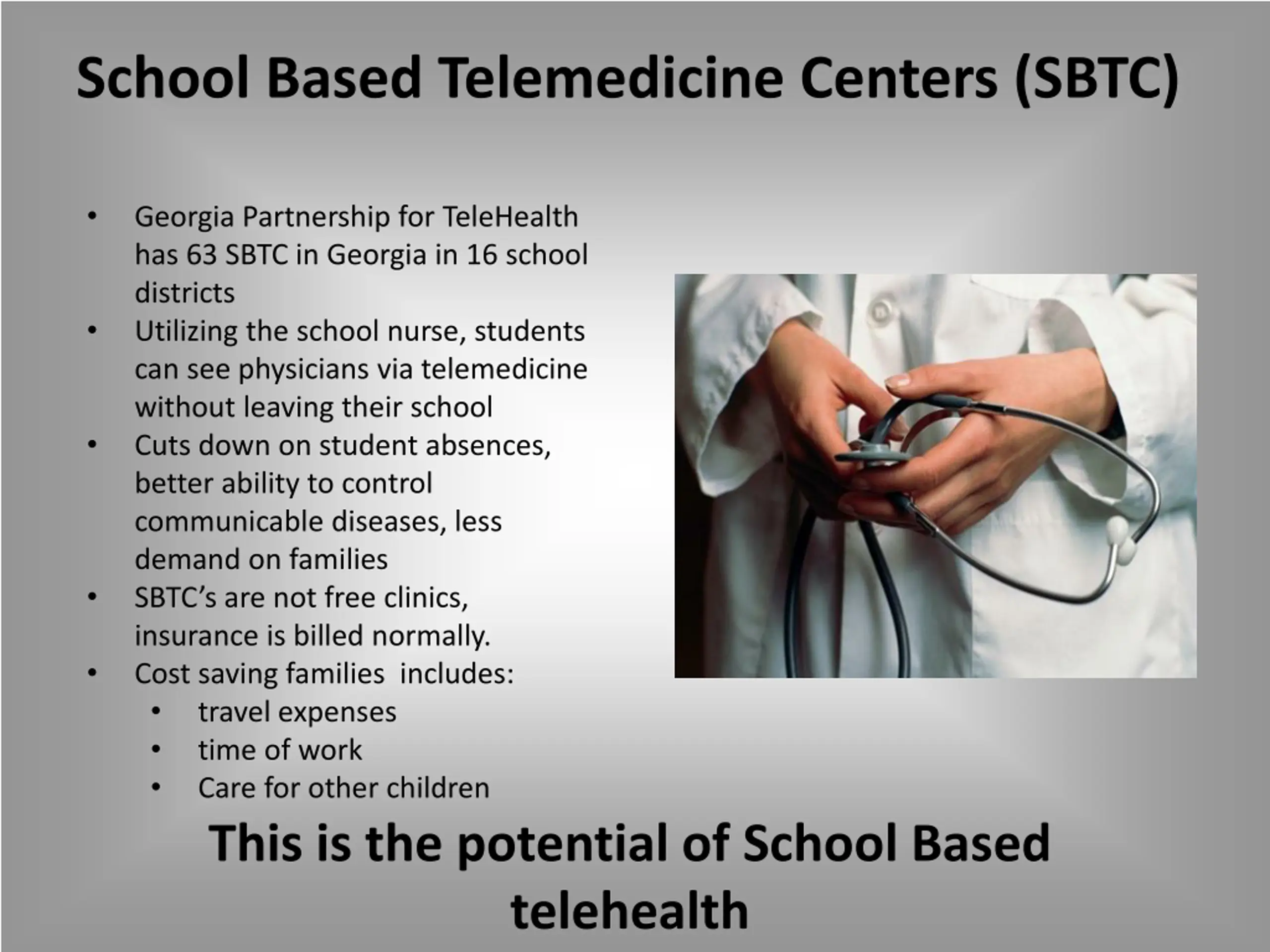 School Based Telemedicine Centers (SBTC) Georgia Partnership for TeleHealth has 63 SBTC in Georgia in 16 school districts Utilizing the school nurse, students can see physicians via telemedicine without leaving their school Cuts down on student absences, better ability to control communicable diseases, less demand on families SBTC s are not free clinics, insurance is billed normally. Cost saving families includes: travel expenses time of work Care for other children This is the potential of School Based telehealth
