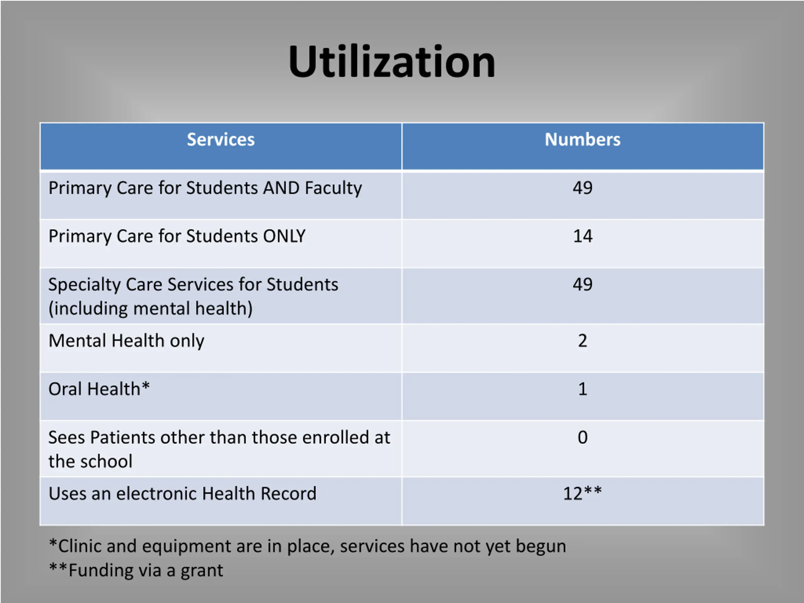 Utilization Services Numbers Primary Care for Students AND Faculty 49 Primary Care for Students ONLY 14 Specialty Care Services for Students (including mental health) 49 Mental Health only 2 Oral Health* 1 Sees Patients other than those enrolled at the school 0 Uses an electronic Health Record 12** *Clinic and equipment are in place, services have not yet begun **Funding via a grant