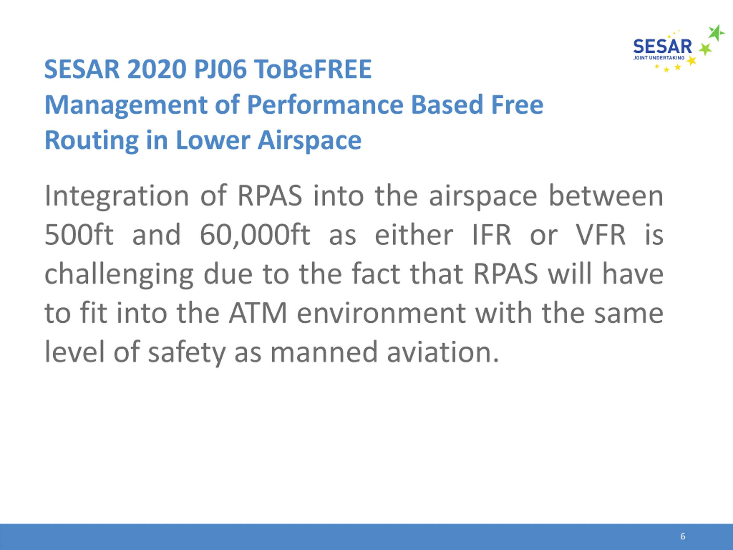 SESAR 2020 PJ06 ToBeFREE Management of Performance Based Free Routing in Lower Airspace Integration of RPAS into the airspace between 500ft and 60,000ft as either IFR or VFR is challenging due to the fact that RPAS will have to fit into the ATM environment with the same level of safety as manned aviation. 6
