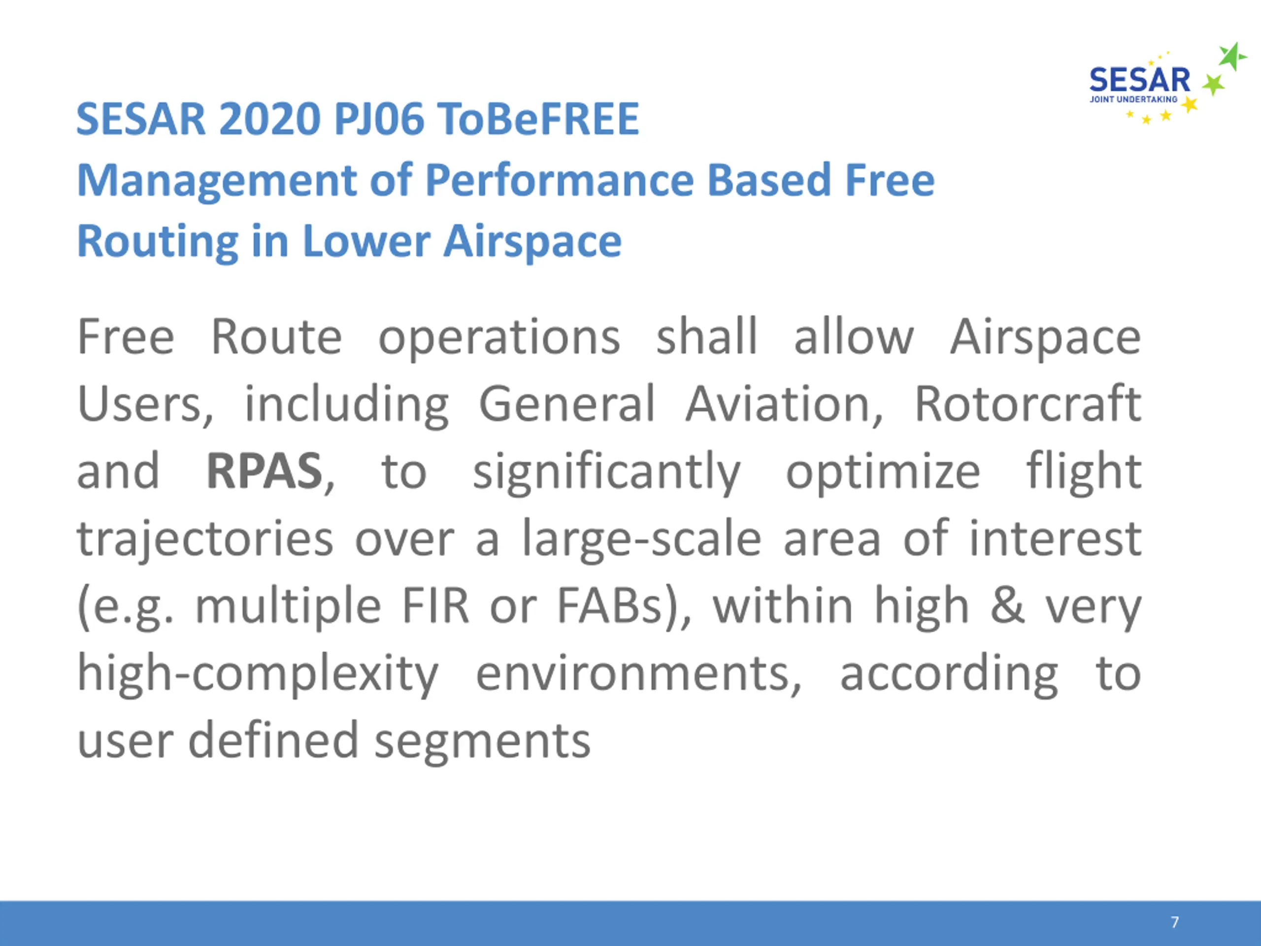SESAR 2020 PJ06 ToBeFREE Management of Performance Based Free Routing in Lower Airspace Free Route operations shall allow Airspace Users, including General Aviation, Rotorcraft and RPAS, to significantly optimize flight trajectories over a large-scale area of interest (e.g. multiple FIR or FABs), within high & very high-complexity environments, according to user defined segments 7