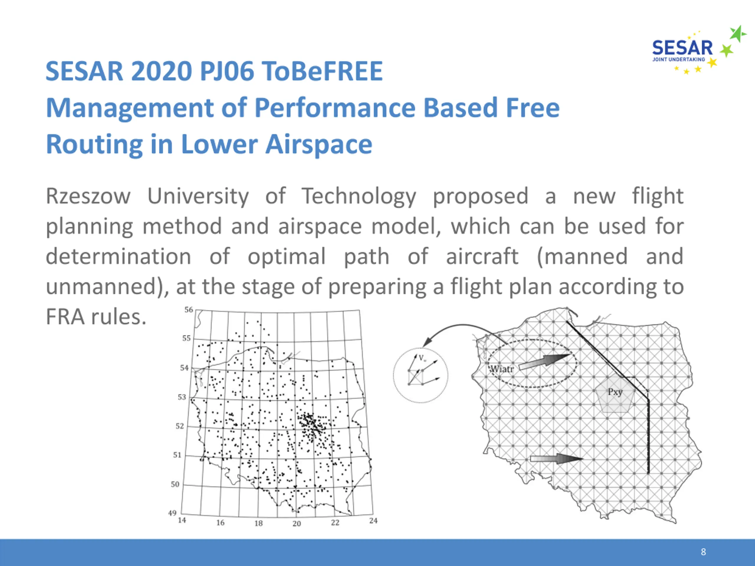 SESAR 2020 PJ06 ToBeFREE Management of Performance Based Free Routing in Lower Airspace Rzeszow University of Technology proposed a new flight planning method and airspace model, which can be used for determination of optimal path of aircraft (manned and unmanned), at the stage of preparing a flight plan according to FRA rules. 8