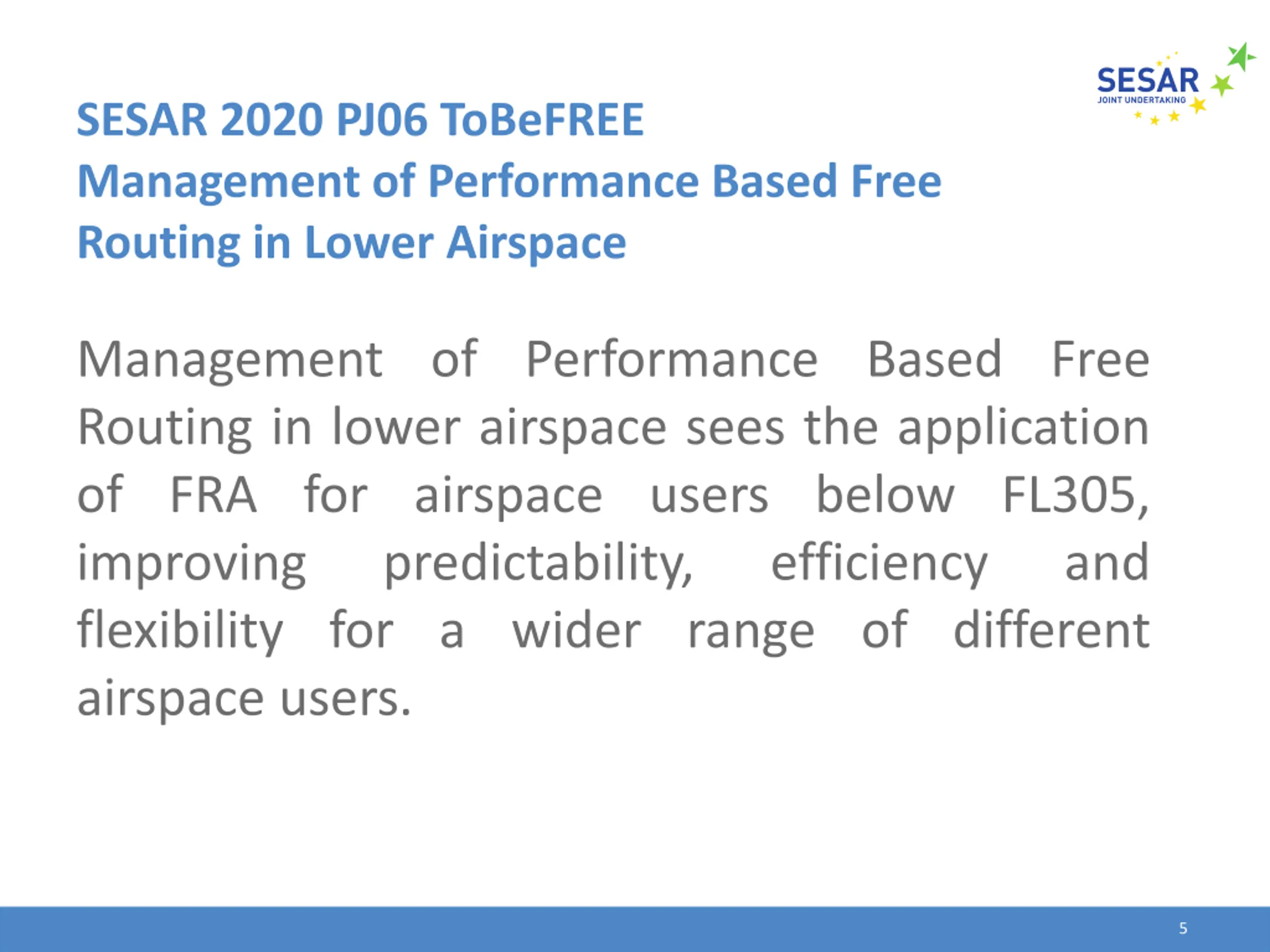 SESAR 2020 PJ06 ToBeFREE Management of Performance Based Free Routing in Lower Airspace Management of Performance Based Free Routing in lower airspace sees the application of FRA for airspace users below FL305, improving predictability, flexibility for a wider range of different airspace users. efficiency and 5