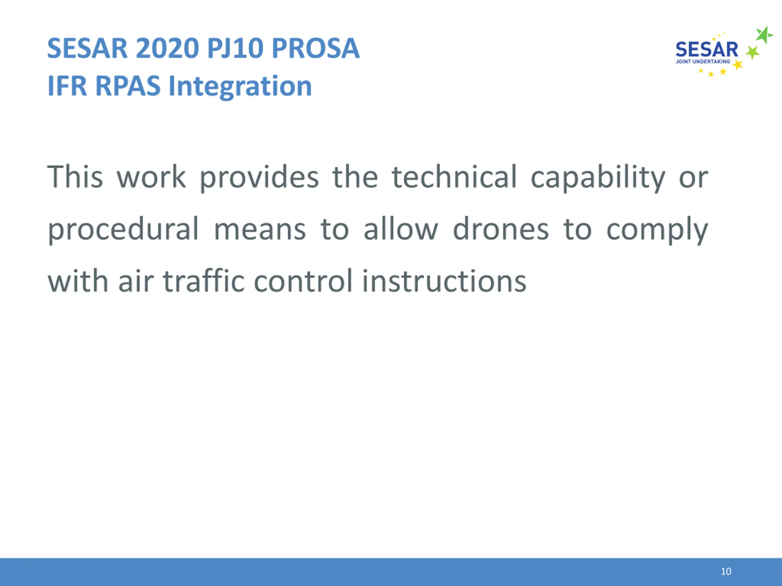 SESAR 2020 PJ10 PROSA IFR RPAS Integration This work provides the technical capability or procedural means to allow drones to comply with air traffic control instructions 10