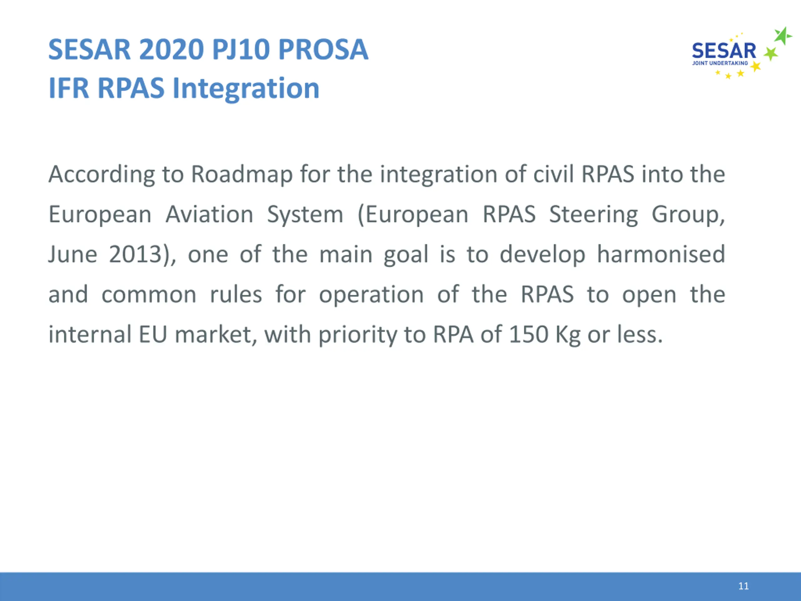 SESAR 2020 PJ10 PROSA IFR RPAS Integration According to Roadmap for the integration of civil RPAS into the European Aviation System (European RPAS Steering Group, June 2013), one of the main goal is to develop harmonised and common rules for operation of the RPAS to open the internal EU market, with priority to RPA of 150 Kg or less. 11