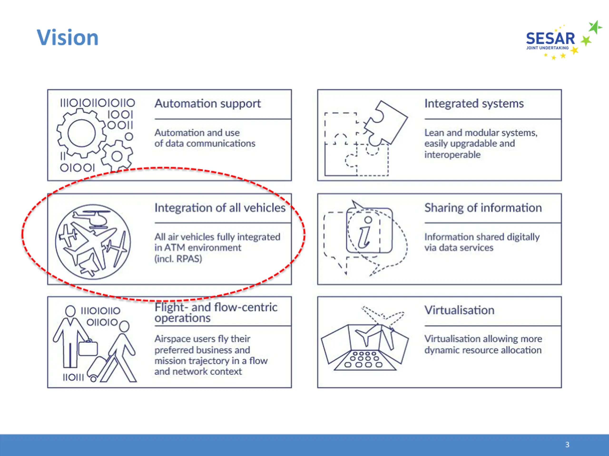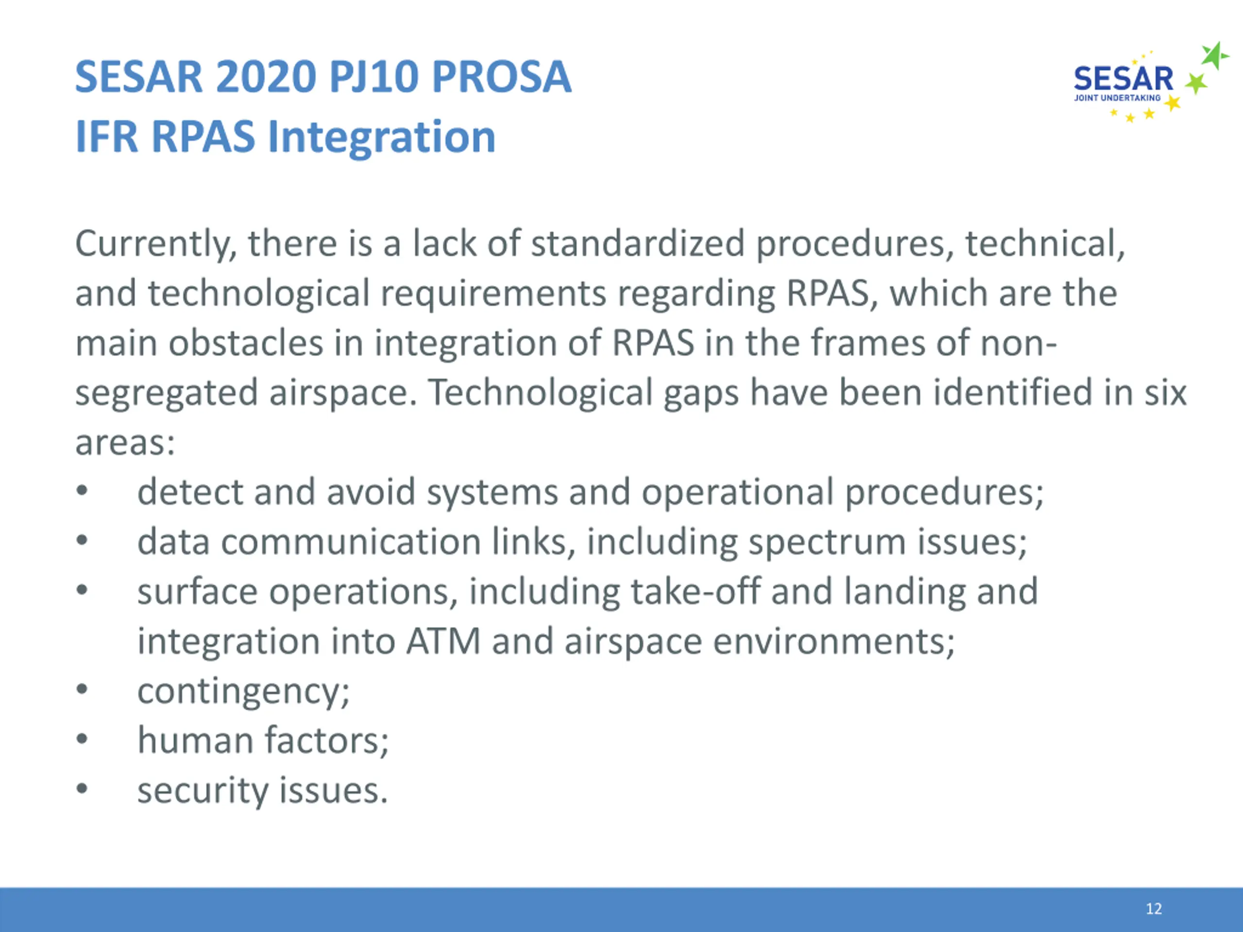 SESAR 2020 PJ10 PROSA IFR RPAS Integration Currently, there is a lack of standardized procedures, technical, and technological requirements regarding RPAS, which are the main obstacles in integration of RPAS in the frames of non- segregated airspace. Technological gaps have been identified in six areas: detect and avoid systems and operational procedures; data communication links, including spectrum issues; surface operations, including take-off and landing and integration into ATM and airspace environments; contingency; human factors; security issues. 12