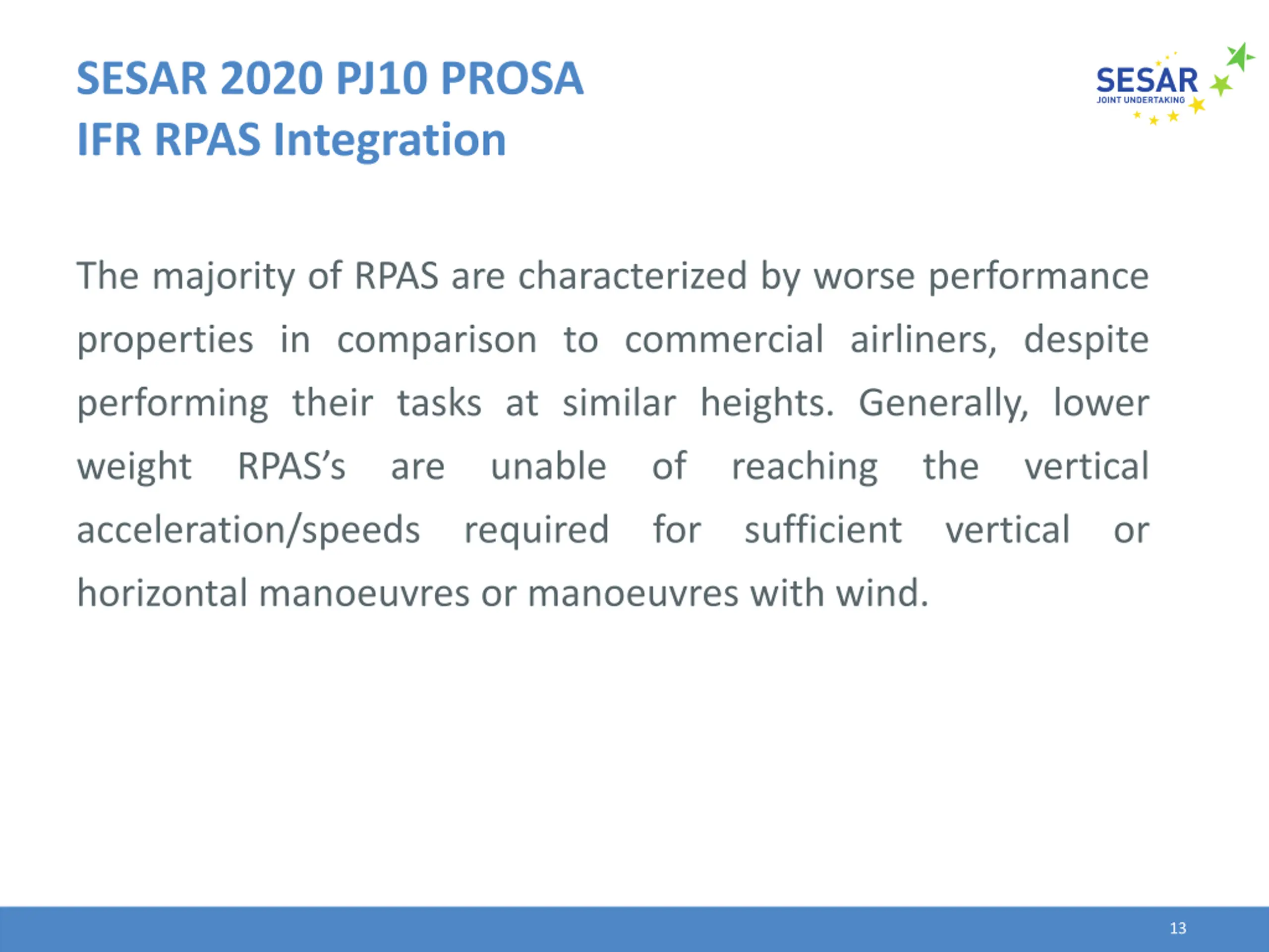 SESAR 2020 PJ10 PROSA IFR RPAS Integration The majority of RPAS are characterized by worse performance properties in comparison to commercial airliners, despite performing their tasks at similar heights. Generally, lower weight RPAS s are unable of reaching the vertical acceleration/speeds required for sufficient vertical or horizontal manoeuvres or manoeuvres with wind. 13